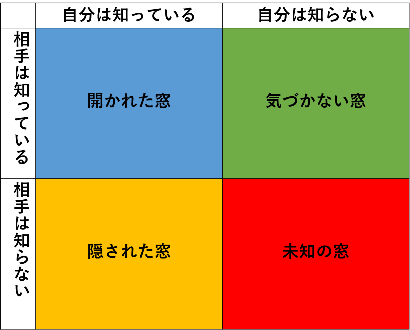 自己理解のための考え方には、ジョハリの窓というものがあります。ジョハリの窓は下記の図のようになります。