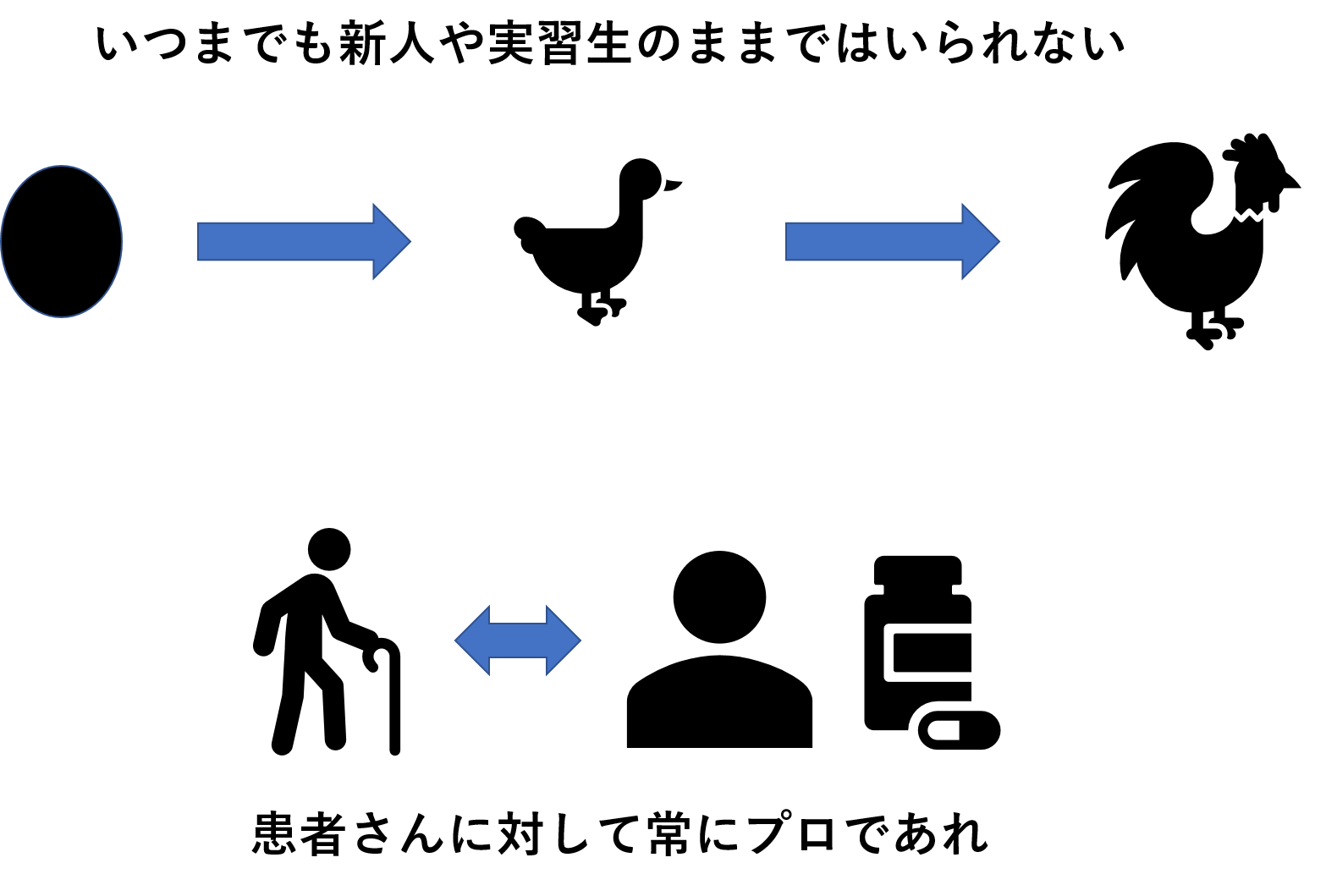 新人や実習生は、はじめのうちは所属しているところで、講義を受けたりして外に出ることが少ないです。しかしどこかのタイミングで患者さんの前に立つことが、出てくると思います。患者さんにとって、白衣を着ていれば、全員医療者に見えます。そこには、新人も実習生も関係ないです。いい意味で、しっかりと責任を感じる必要があります。