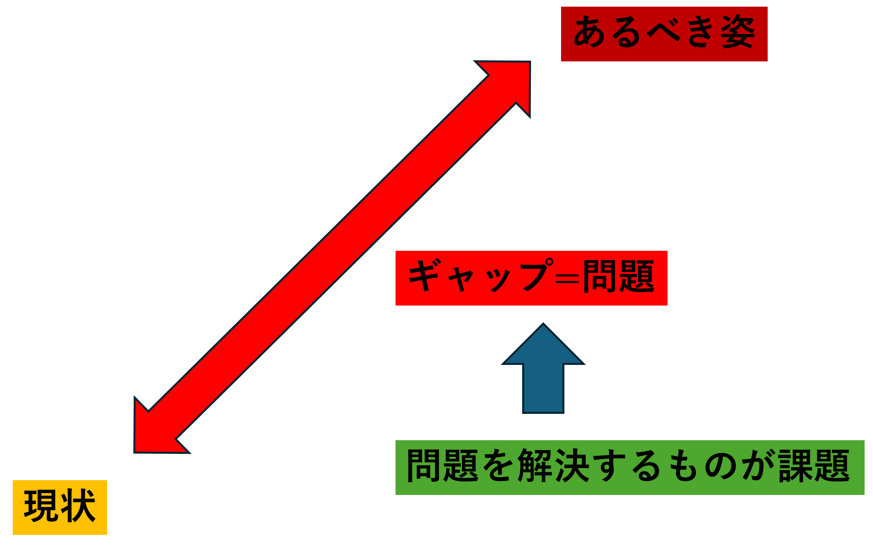 このあるべき姿と、現状のギャップが「問題」ということができます。そして、その問題を解決するために具体的に取り組むものが「課題」ということができます。