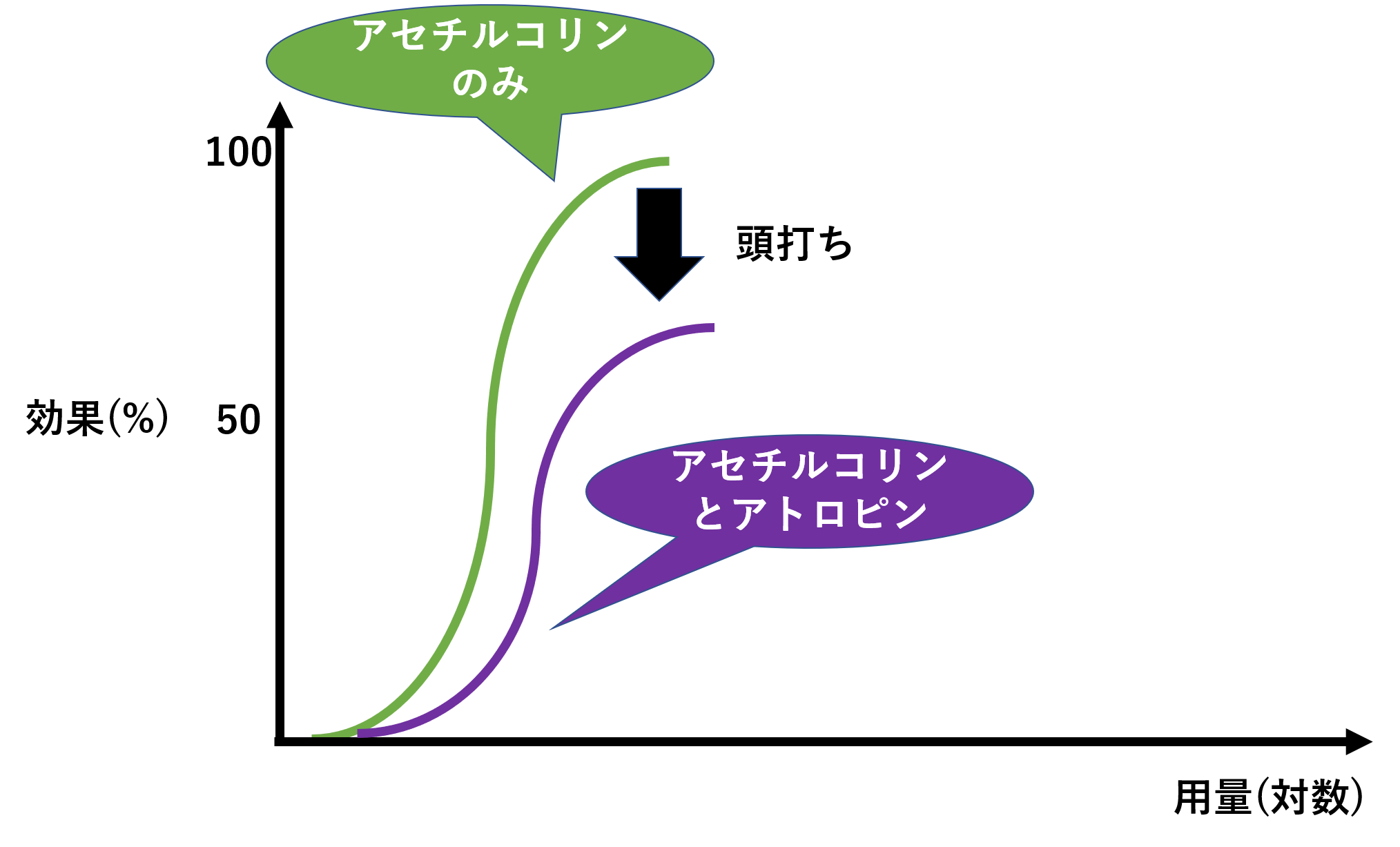 アセチルコリンだけの時のグラフに対して、アトロピンがある場合はアトロピンをどかす分、余計にアセチルコリンが必要となります。そのため用量-反応曲線の効果は100%のまま高濃度側(右側)に水平移動します。