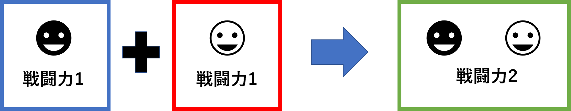 同じく先ほどの例とすると、〇空と〇リリンになります。〇空と〇リリンは小さいころから、ともに修業した仲です。同じく戦闘力を〇空が1、〇リリンが1だとしましょう。この場合で、二人が協力して戦闘すると、息の合ったコンビプレーで戦闘力「1+1」が2ではなく、3となるのです。