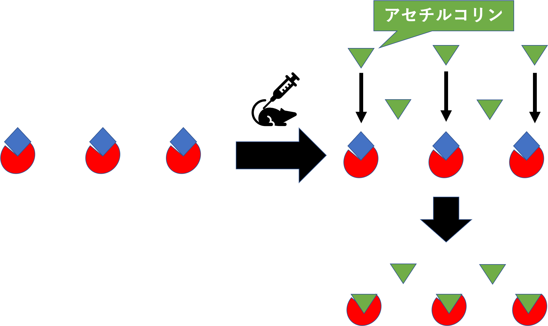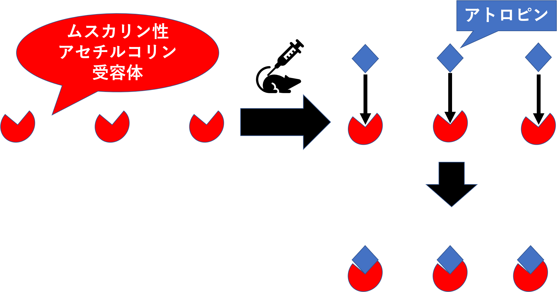 アトロピンをマウスに投与したとします。この時、ムスカリン性アセチルコリン受容体にくっついていき、全てのムスカリン性アセチルコリン受容体にアトロピンがくっついている状態になります。