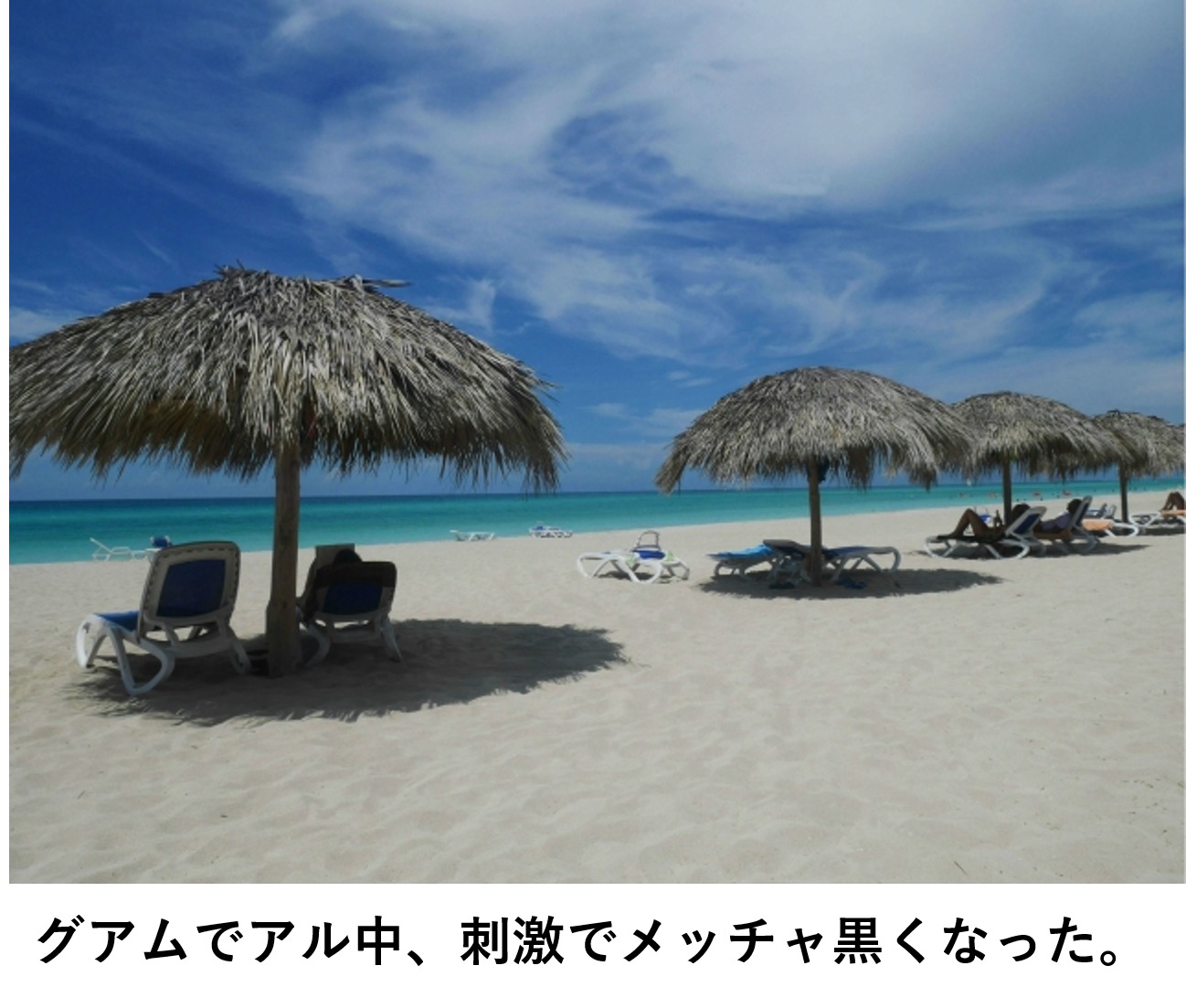 誰も助けてくれず、路上で寝ていたら、グアムの暑い日差しの刺激でとても日焼けしてしまったというお話です。