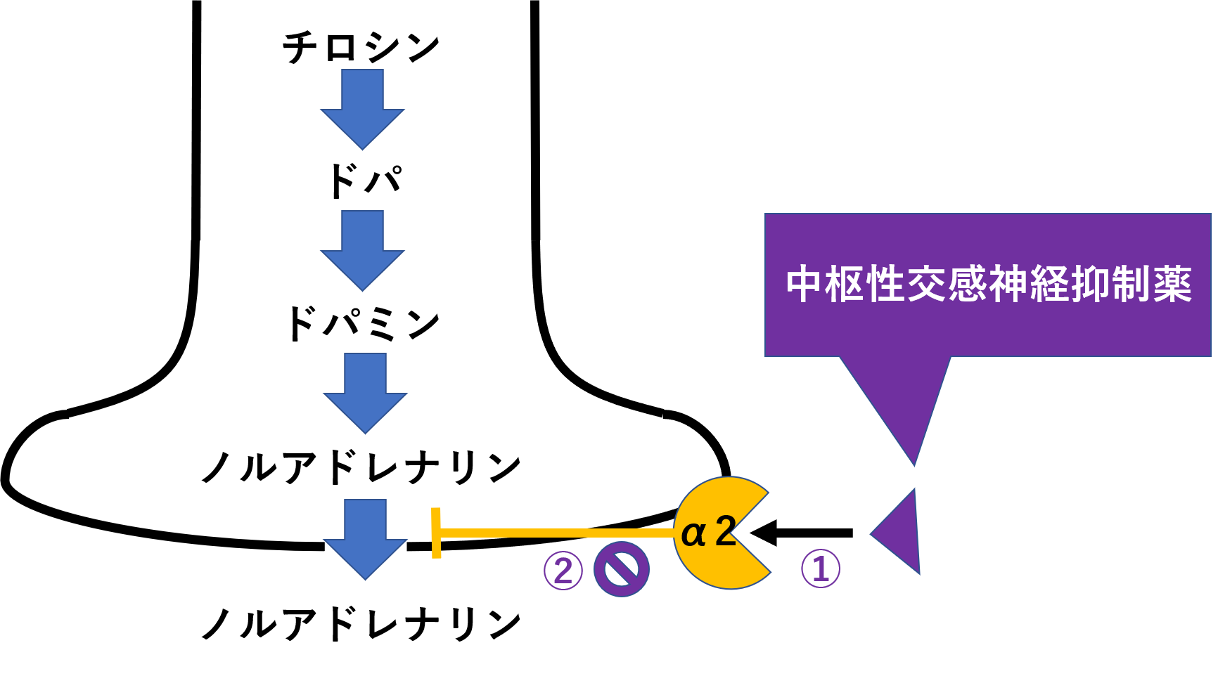血管運動中枢のα2受容体を刺激することで、末梢血管が拡張して降圧作用を示します。また、アドレナリン作動性神経にもα2受容体があり、これを刺激するとノルアドレナリンの遊離が抑えられます。