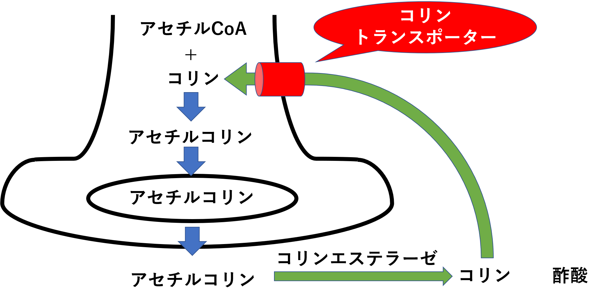 アセチルコリンはコリンエステラーゼ(Cholinesterase;ChE)と呼ばれる酵素によって、酢酸とコリンに分解されます。アセチルCoAとコリンではないので注意してください。分解によって出てきたコリンは、コリントランスポーターと呼ばれるリサイクル会社みたいなものを通して、節後線維に取り込まれ再利用されます。