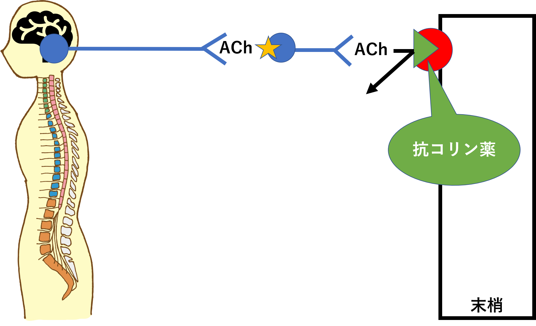 ムスカリン性の作用は、抗コリン薬によって抑えられてしまうので、効果は出ません。