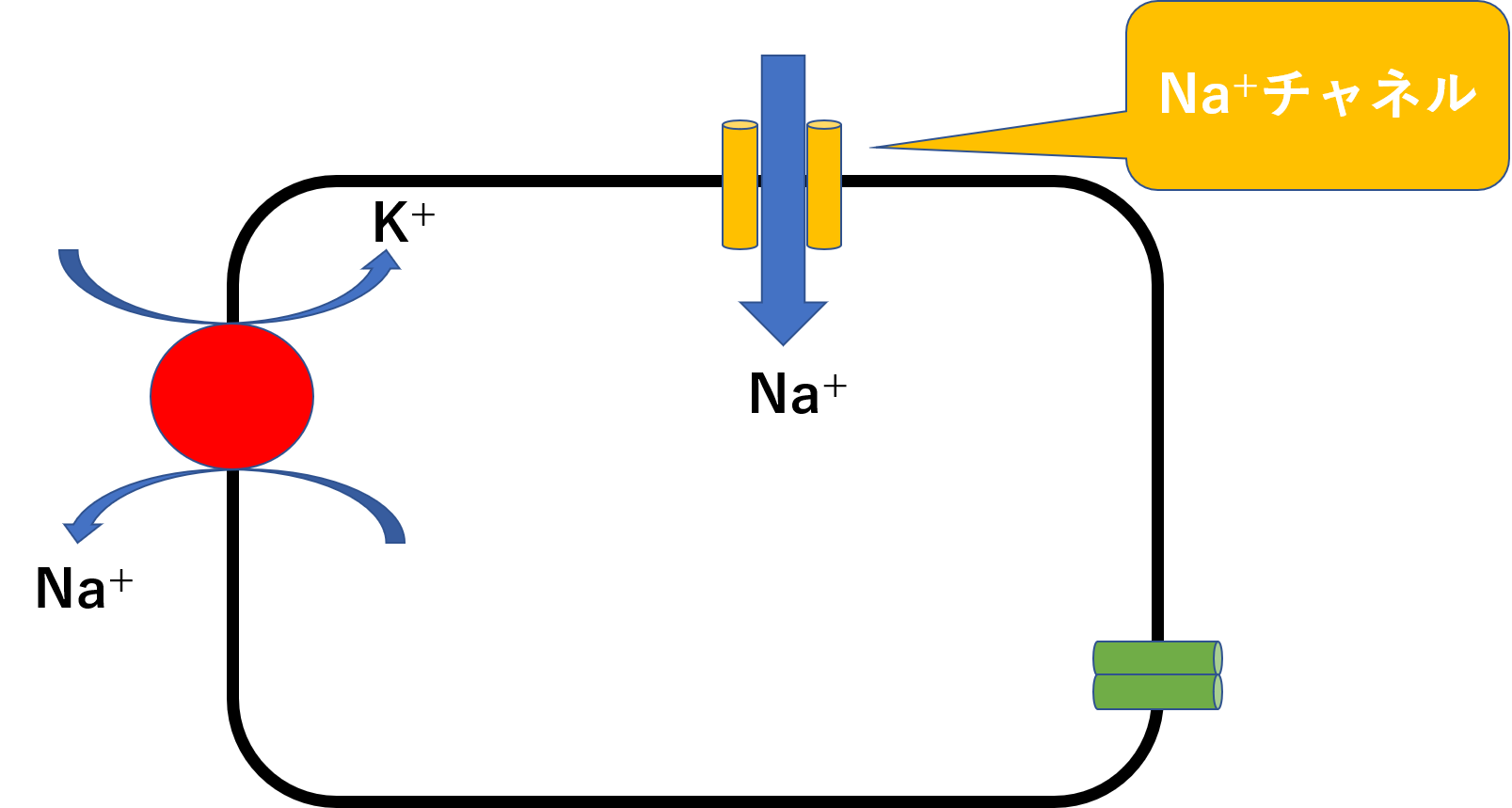 細胞膜にはNa+チャネルと呼ばれるトンネルもあります。このトンネルを通してNa+が細胞内へ入ってきます。