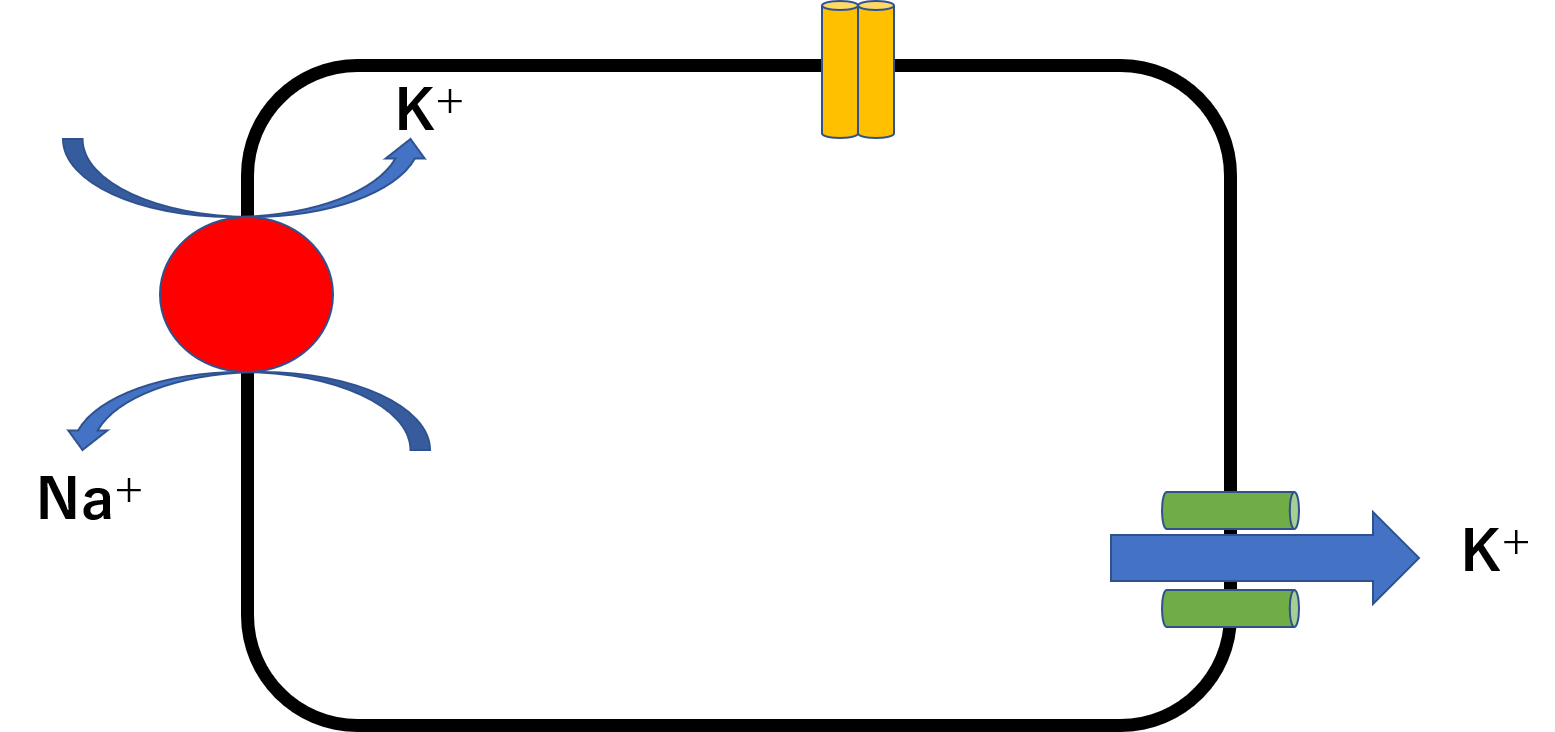 細胞膜にNa+,K+ATPaseと呼ばれるポンプがあります。これによってNa+が細胞外に出て、逆にK+が細胞内へ入ってきます。
