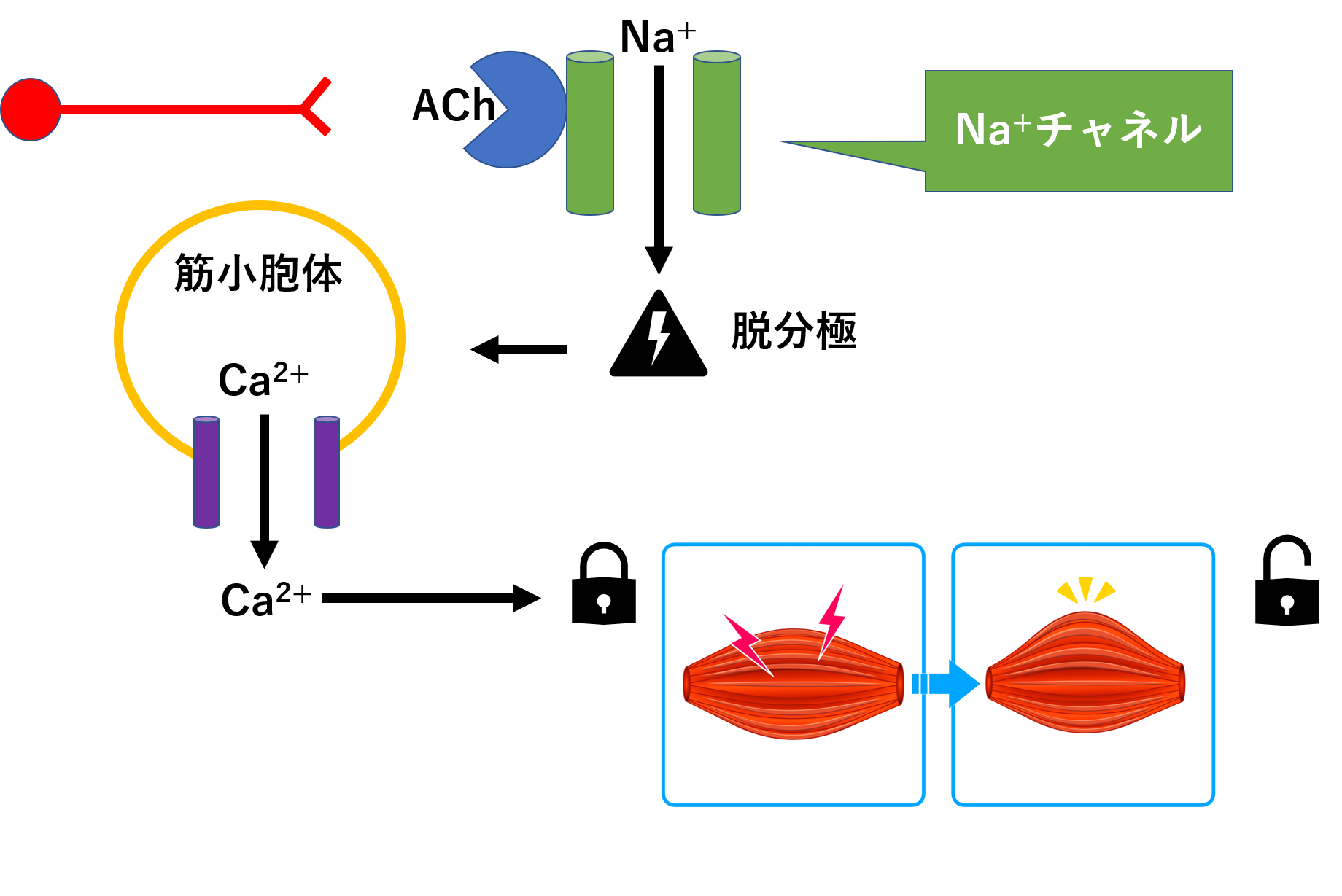 アセチルコリンとニコチン性アセチルコリン受容体がくっつき、筋収縮が起こると言いました。ここで、ニコチン性アセチルコリン受容体から筋収縮までをもう少し細かく見ていきましょう。
