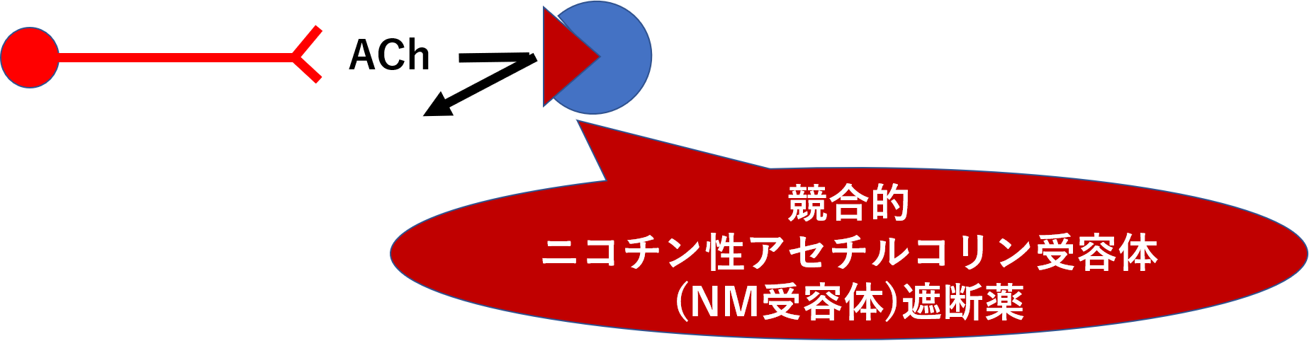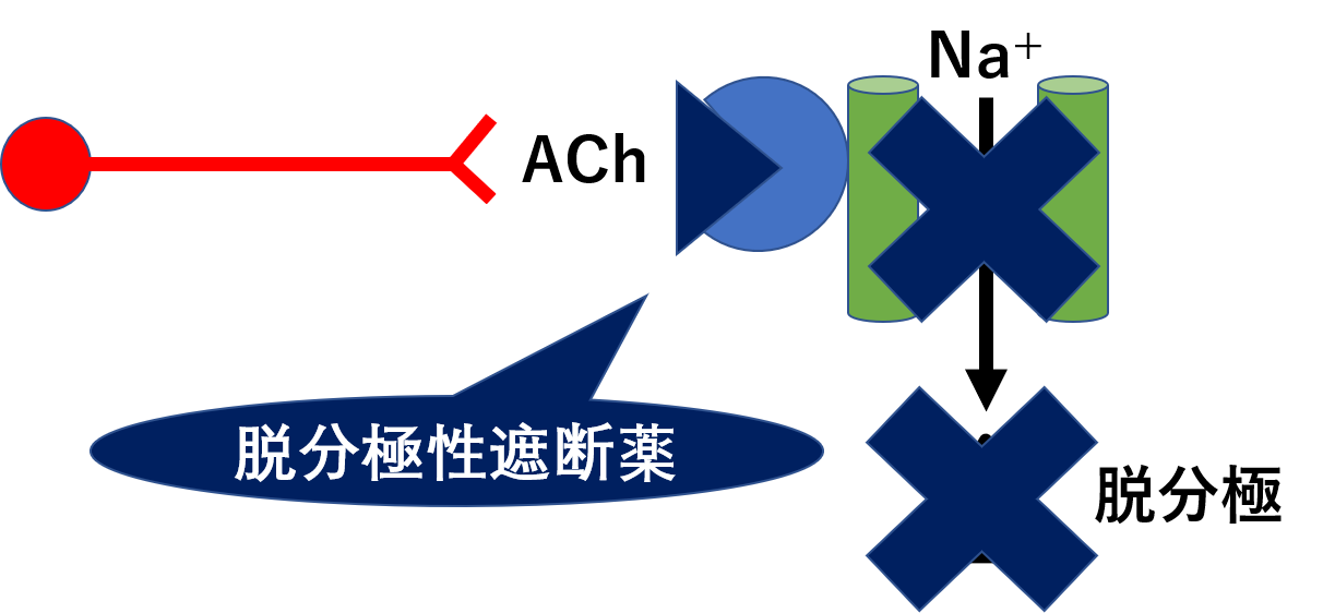 ニコチン性アセチルコリン受容体(NM受容体)を刺激することで、はじめは筋収縮を起こしますが、持続的に刺激することでNa+チャネルが不活化し最終的にはニコチン性アセチルコリン受容体(NM受容体)を遮断する変わった薬です。