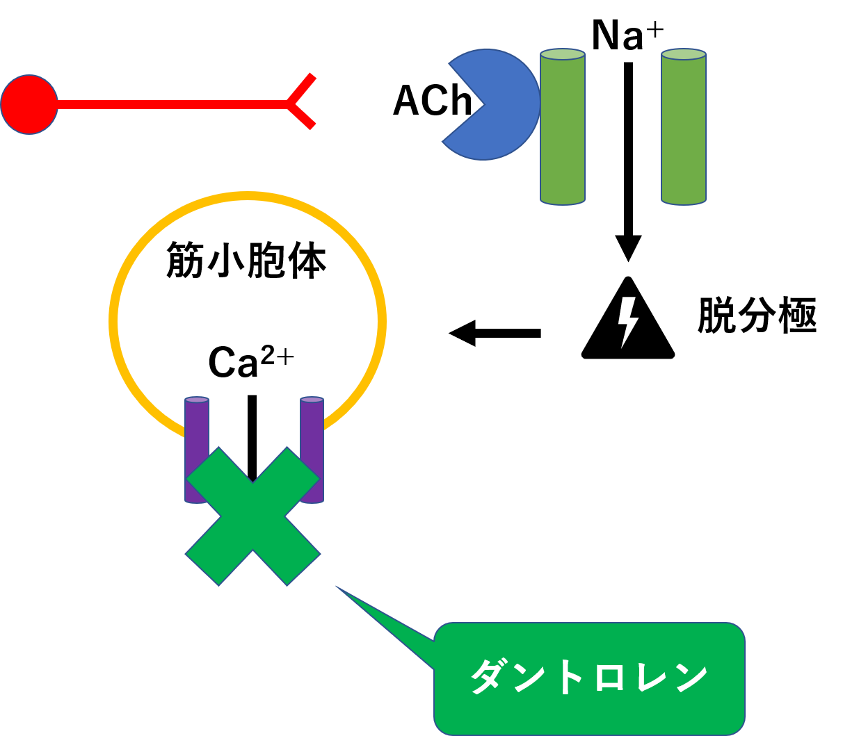 Ca2+の遊離抑制だけでなく、直接の筋刺激による収縮も抑えることができます。向精神薬などの副作用で有名な悪性症候群などに使われます。