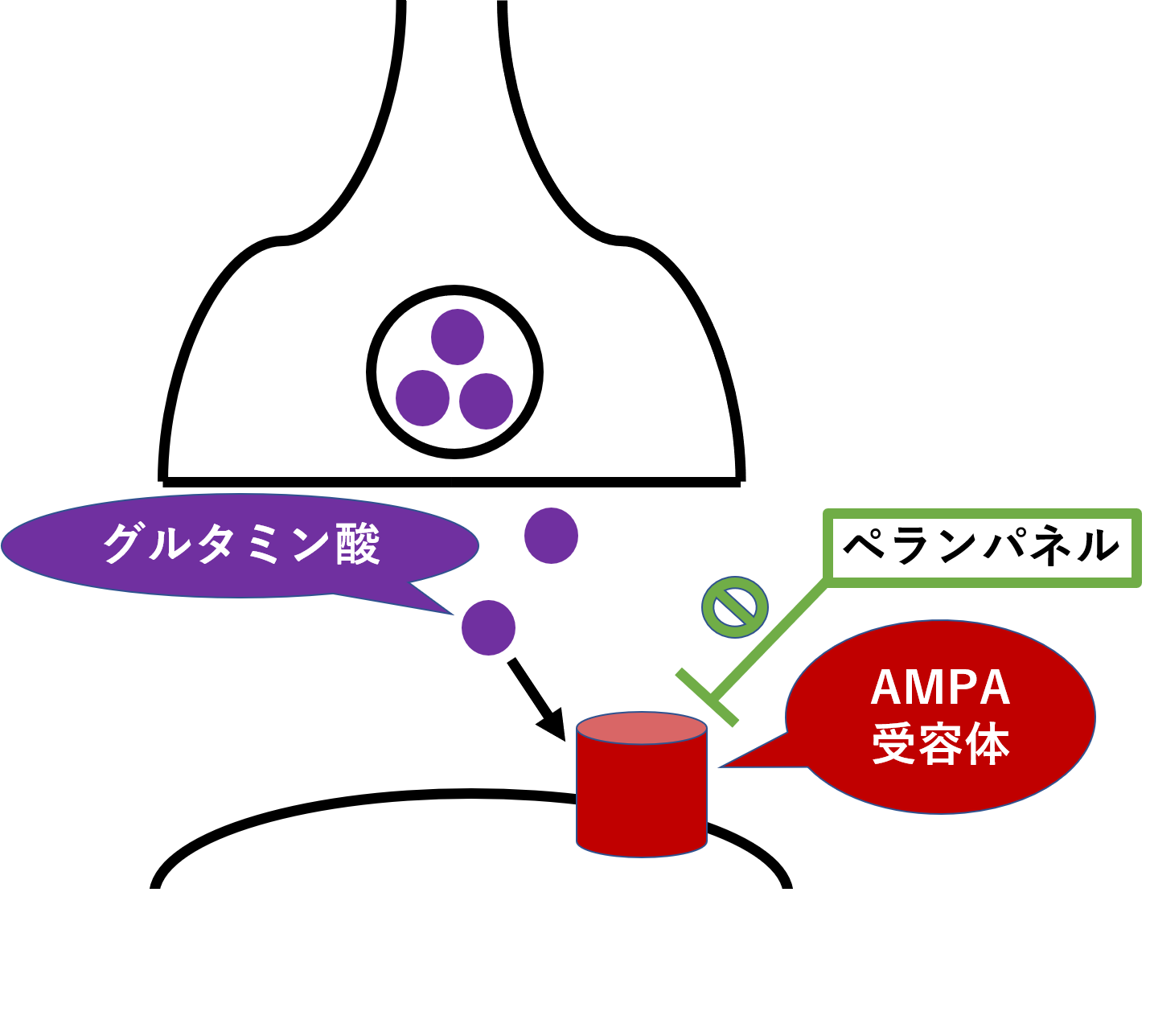 ペランパネル(フィコンパ)はAMPA型グルタミン酸受容体に対して非競合的にくっつくことで、グルタミン酸による神経興奮を抑えます。