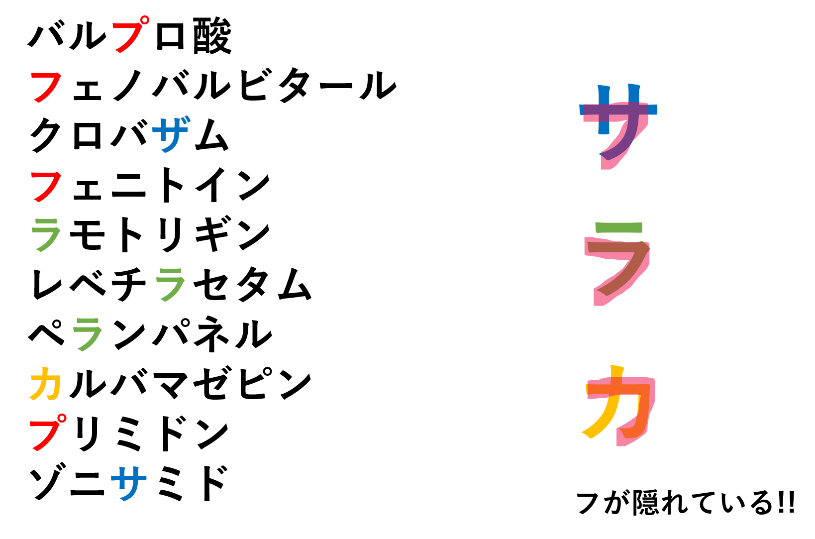 この3つのルールで国試は結構解けるはず・・・。もちろん全てのてんかん薬を載せていませんし、この法則に当てはまらないものもあるのでご利用は計画的にお願いします(笑)