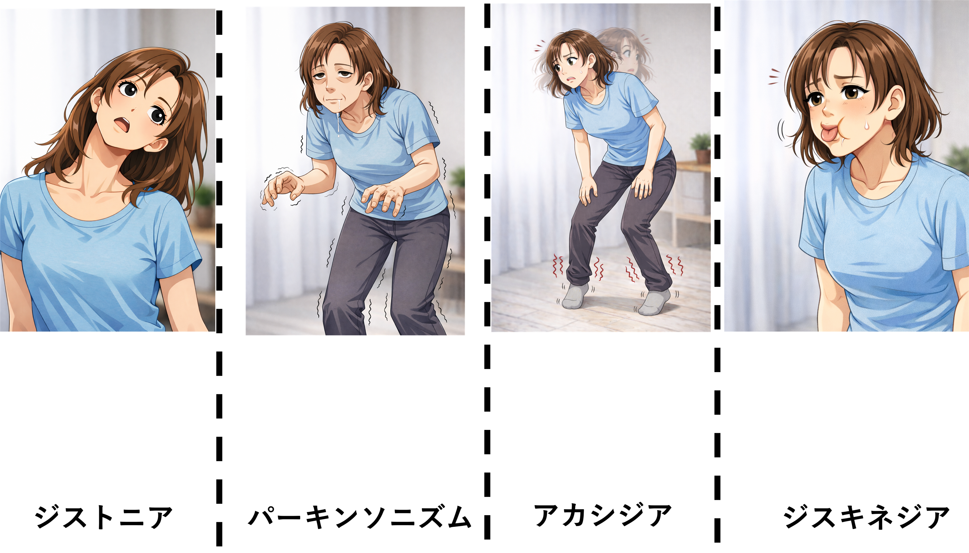 ジスキネジアはdys(異常、困難)とkinesis(運動)が言葉の由来です。自分の意思と関係なく体が勝手に動いてしまい、具体的には口をモグモグさせる、下を突出させたり鳴らしたりするなどがあります