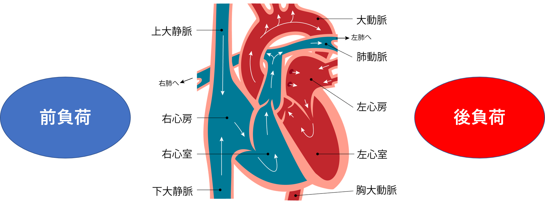 体液量や血管抵抗が増えることは心臓にとって、とても負担になります。心臓より手前の段階、つまり心臓に戻る血液量による負荷を前負荷と言います。逆に心臓のあと、つまり末梢血管抵抗による負荷を後負荷と呼びます。