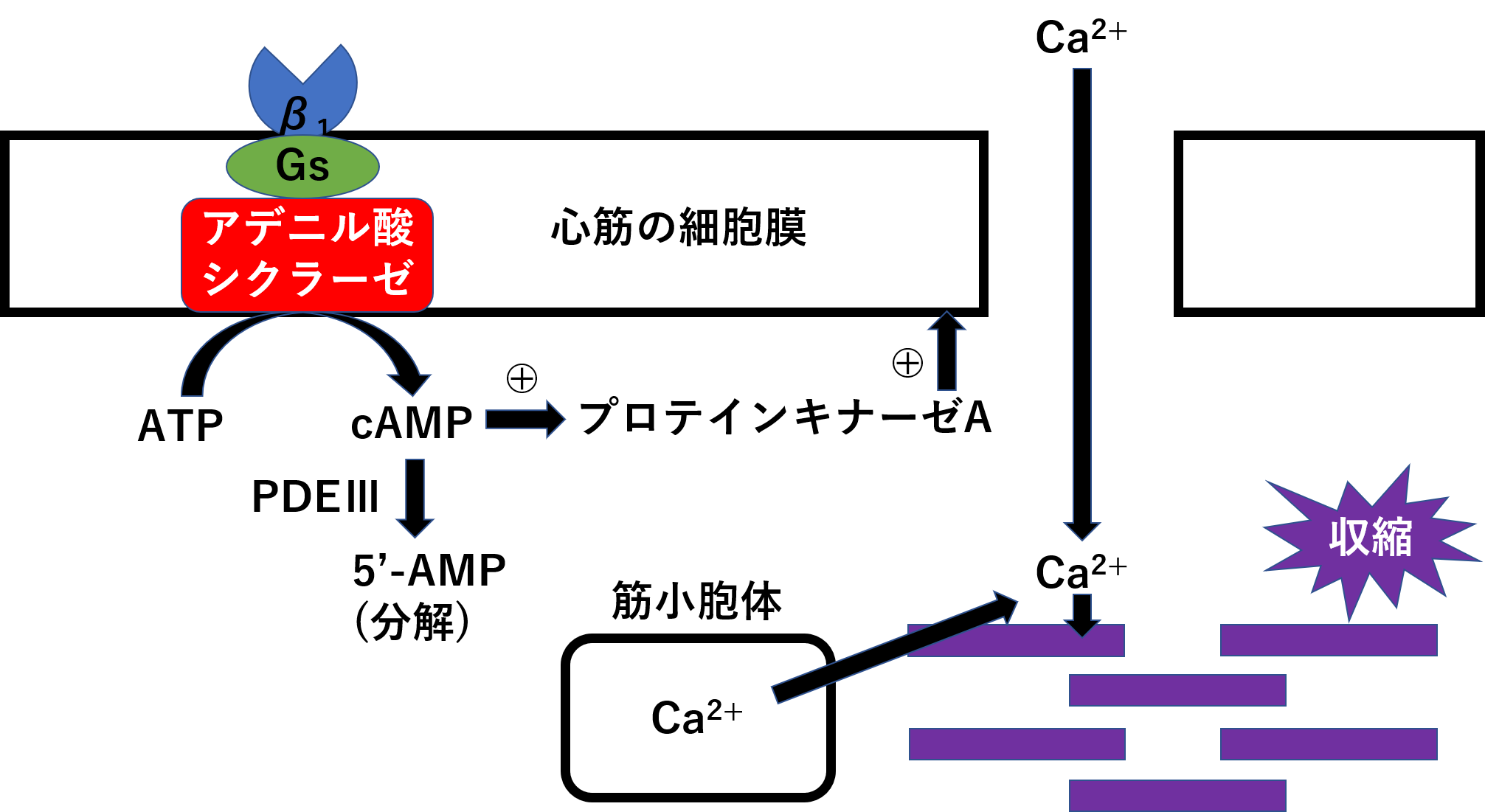 心筋のβ1受容体が刺激されると、アデニル酸シクラーゼが活性化されます。アデニル酸シクラーゼが活性化されると、ATPからcAMPが増えます。cAMPが増えるとプロテインキナーゼAと呼ばれるリン酸化酵素が活性化し、心筋の収縮力を高めます。「〜アミン」なので覚えやすいと思います。