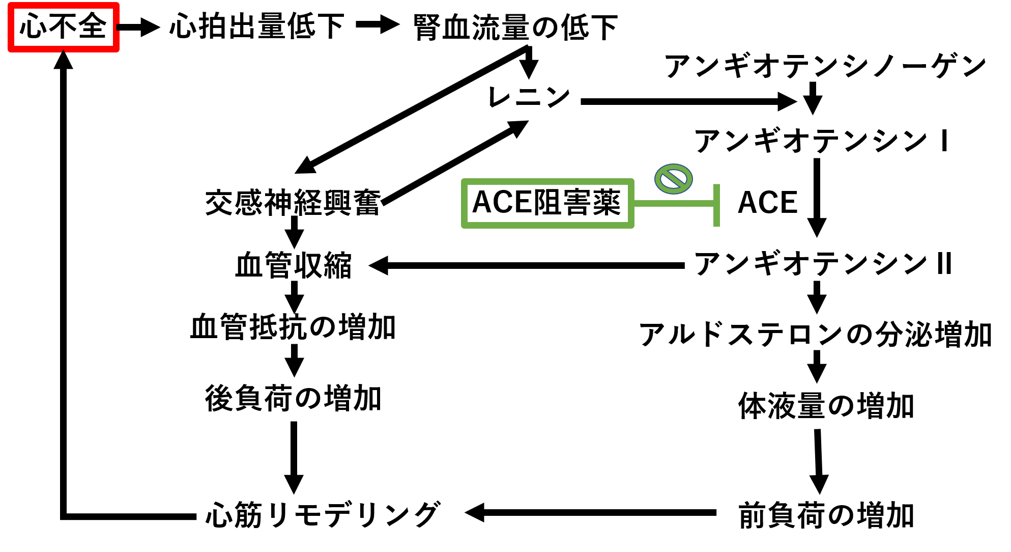 レニン-アンギオテンシン-アルドステロン系で出てきた、ACEを阻害します。そうすることで前負荷と後負荷の軽減をはかり、レニン-アンギオテンシン-アルドステロン系の悪循環をしないようにします。
