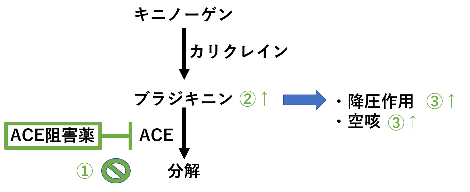 また、アンギオテンシン変換酵素(ACE)は別名キニナーゼUとも呼ばれており、もちろんアンギオテンシン変換酵素阻害薬(ACE阻害薬)は阻害します。キニナーゼUの働きは、ブラジキニンという物質を分解することです。しかし、アンギオテンシン変換酵素阻害薬(ACE阻害薬)を投与することで、キニナーゼUは阻害されてしまい、ブラジキニンの分解が阻害されてしまいます。ブラジキニンは血圧を下げる作用もあるのですが、咳の誘発する原因とも考えられているため、アンギオテンシン変換酵素阻害薬(ACE阻害薬)の特徴的な副作用として空咳があります。
