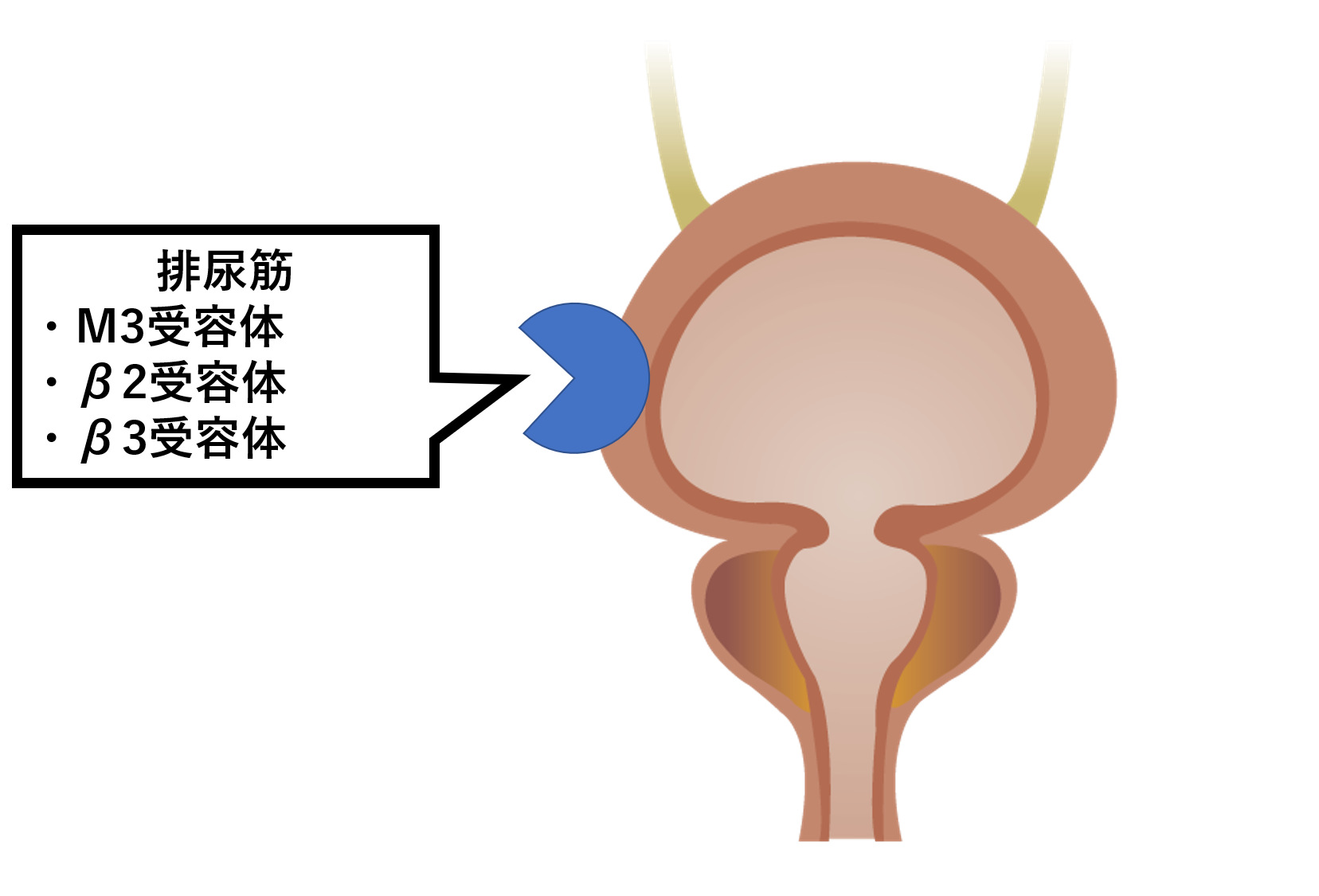 先ほどM3受容体を刺激することで、排尿筋が収縮するという話をしました。これらの薬はM3受容体を遮断することで、排尿筋を弛緩させます。