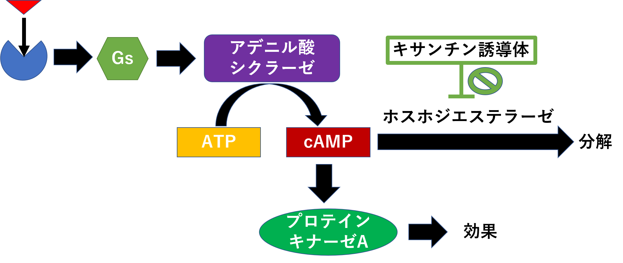 しかし、cAMPはホスホジエステラーゼという酵素によって分解されてしまいます。これらのキサンチン誘導体はホスホジエステラーゼを阻害することでcAMPの分解を防ぎます。
