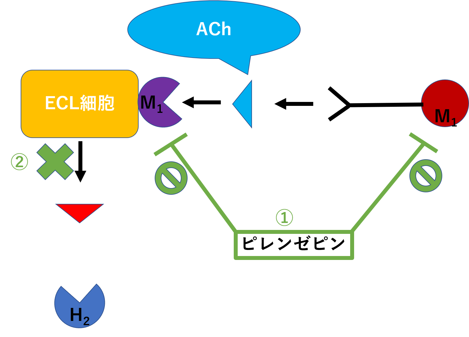 先ほどのH2受容体遮断薬で出てきたヒスタミンですが、ヒスタミンはECL細胞(エンテロクロマフィン細胞)から出てきます。ECL細胞にはムスカリンM1受容体がついていて、副交感神経から出たアセチルコリン(ACh)がくっつくと、ヒスタミンを出します。