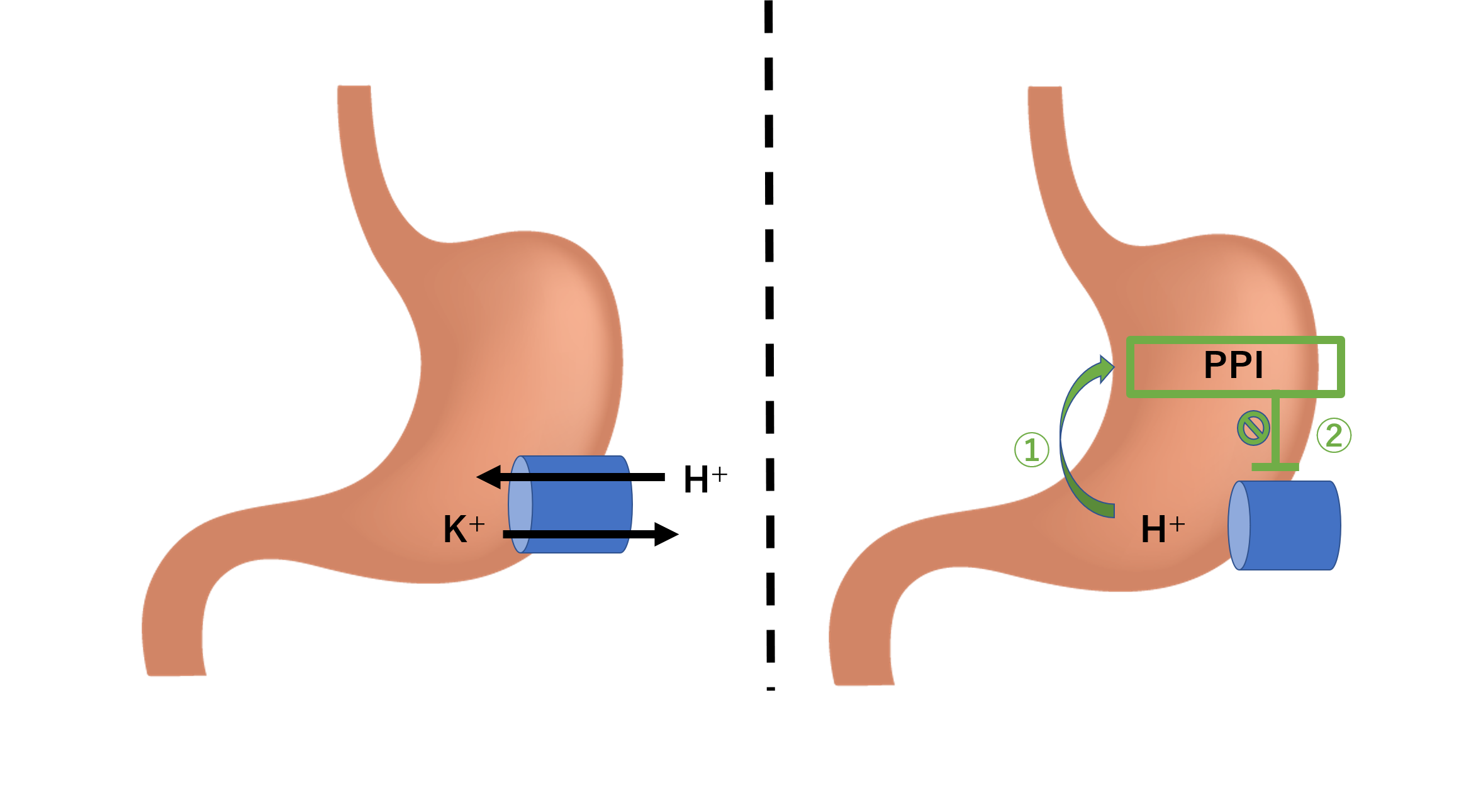 プロトンポンプと呼ばれるH+とK+を交換するポンプのようなものがあり、このポンプによってH+が胃に出てきて、胃酸となります。