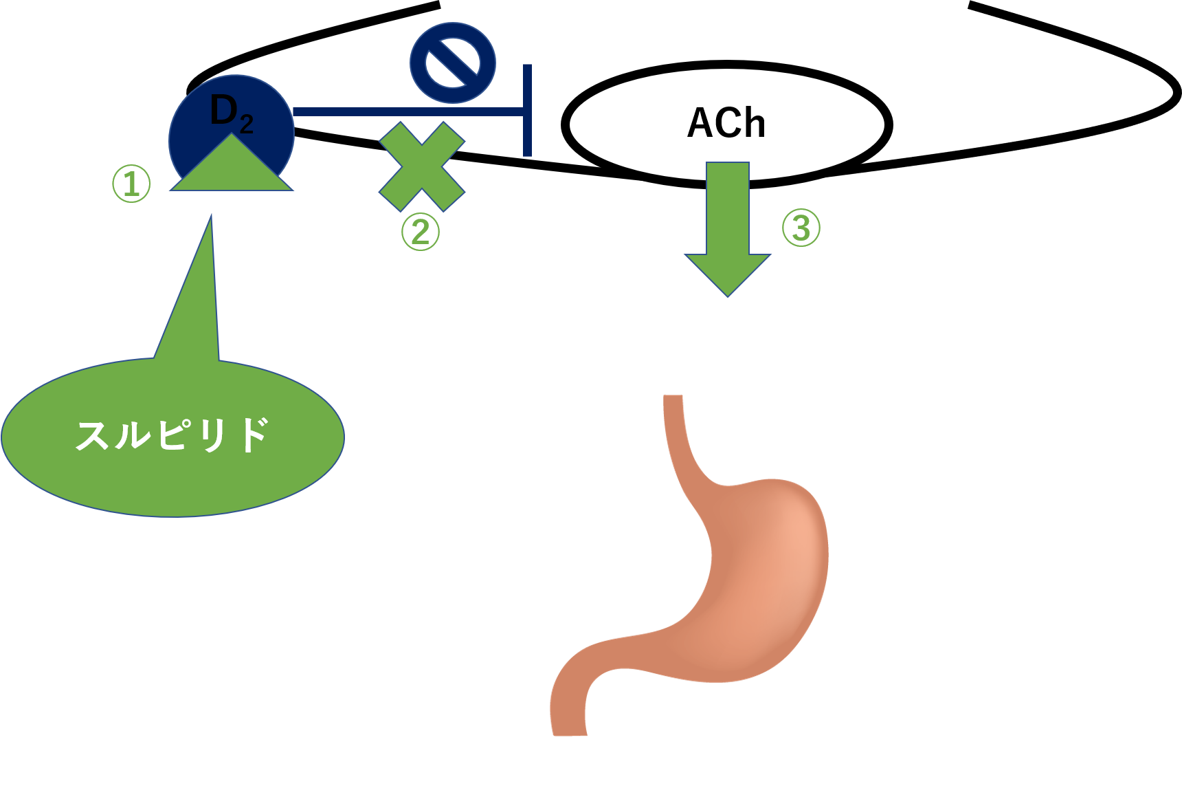 胃が運動するには、副交感神経から出てくるアセチルコリンが必要です。副交感神経のアセチルコリンの遊離に関わるものの1つとして、D2受容体があります。このD2受容体は、アセチルコリンの遊離の抑制に関わります。