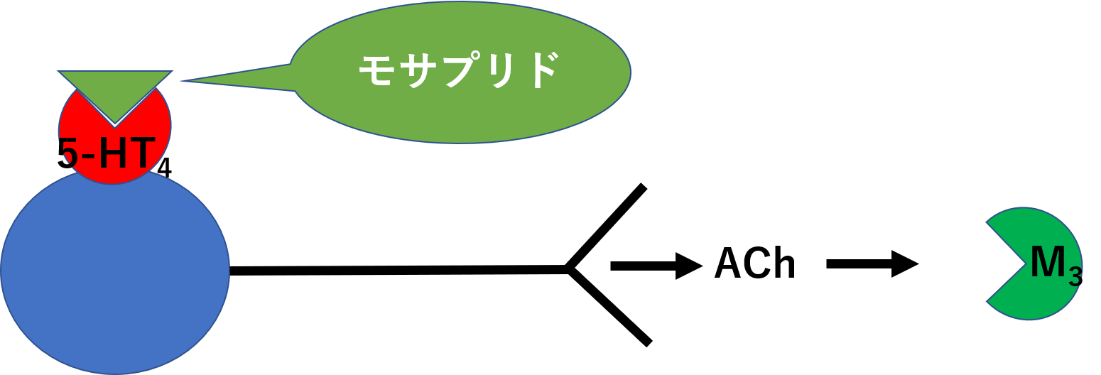 小腸にあるコリン作動性神経は、5-TH4受容体を持ちます。この5-HT4受容体を刺激すると、アセチルコリンが遊離されて、胃腸の運動が促進されます。