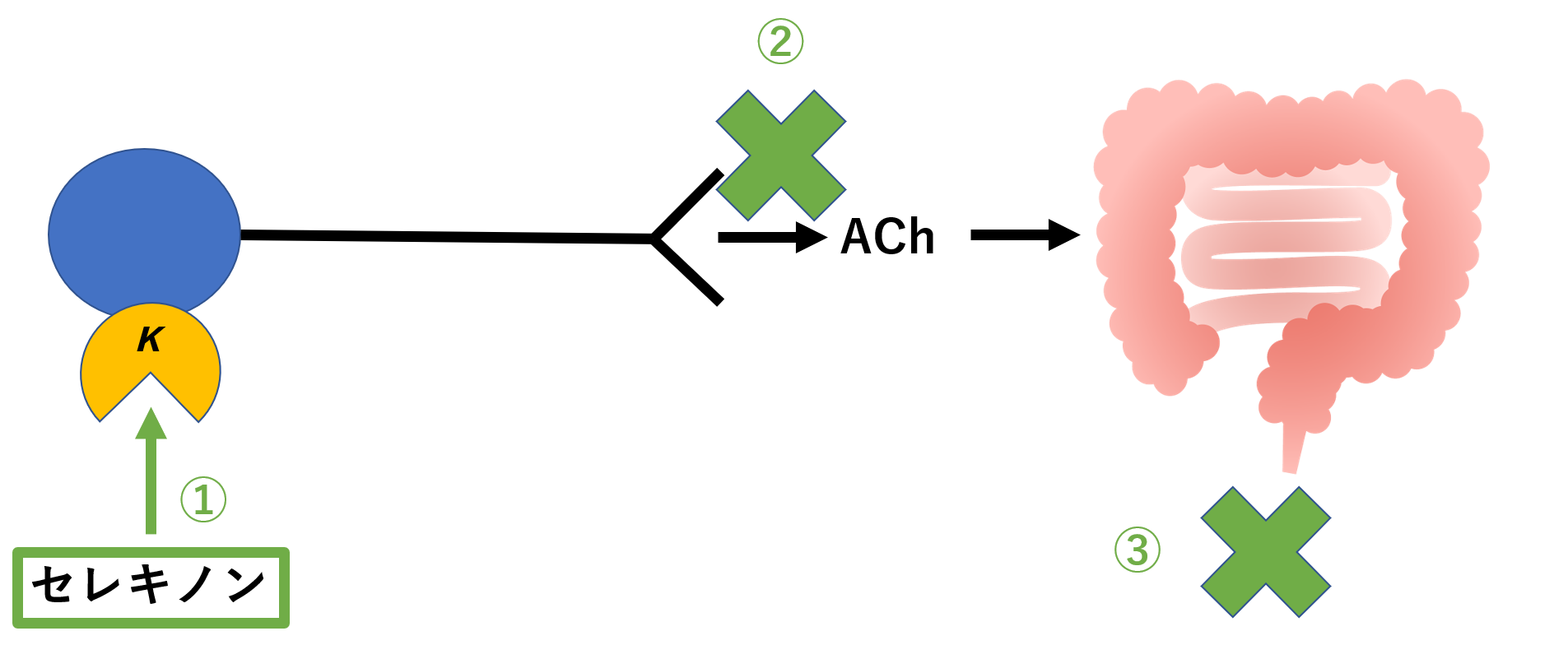 κ受容体にセレキノン(トリメブチン)が作用すると、副交感神経が抑制されます。その結果、アセチルコリン(ACh)の遊離が抑制されます。アセチルコリンは腸管を動かすのに必要な伝達物質であるため、腸管の動きが抑えられます。