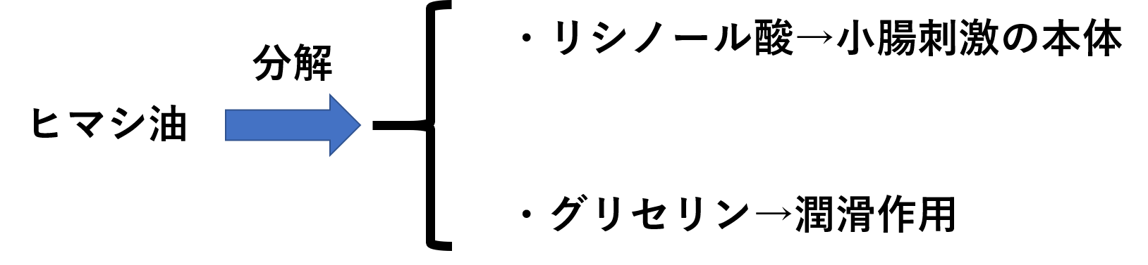 ヒマシ油は小腸でリパーゼという酵素により分解されて、リシノール酸とグリセリンになります。そのうち、リシノール酸が小腸を刺激することで腸の動きを良くします。