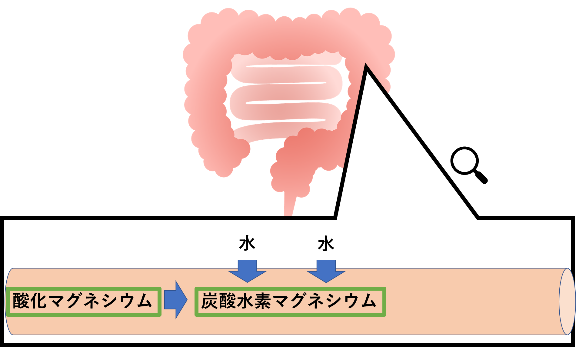 マグミット(酸化マグネシウム)は、炭酸水素マグネシウムに腸内で分解されます。この炭酸水素マグネシウムは腸管から吸収されにくいため、浸透圧が高まります。浸透圧が高まると、腸管に水分を引っ張るので、便を柔らかくすることができます。