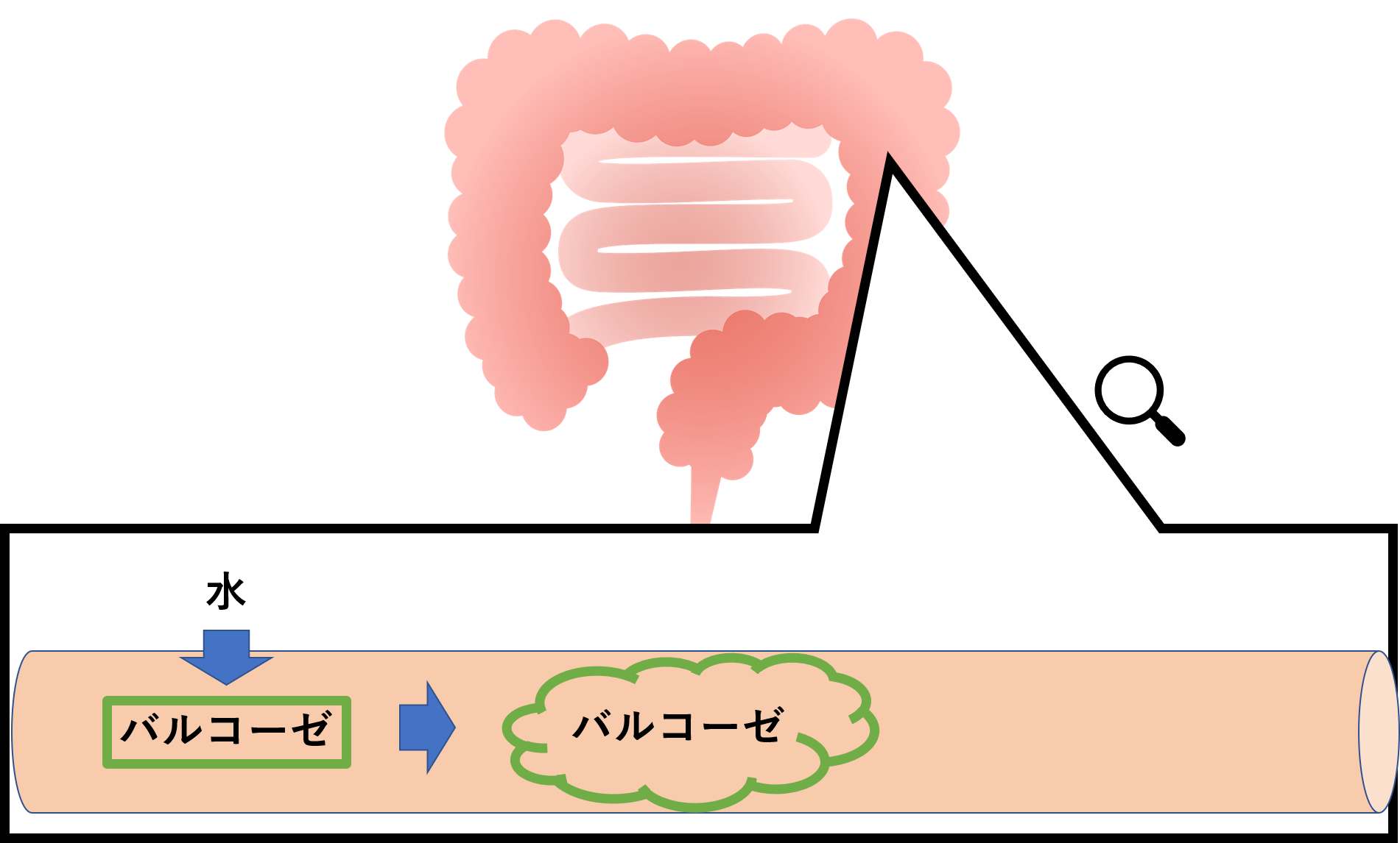 バルコーゼ(カルメロース)は、腸管内の水分を吸収して膨張することで、排便を促進します。