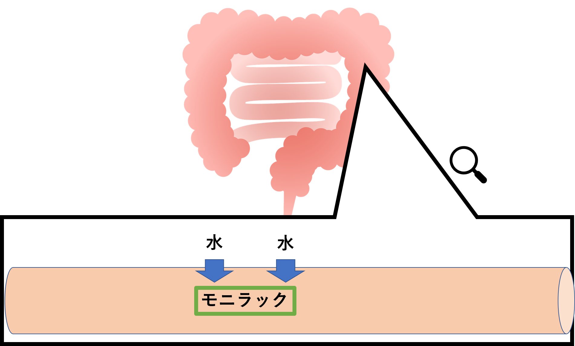モニラック(ラクツロース)を飲むと、ヒトはモニラック(ラクツロース)を分解する酵素を持たないため、下部消化管に到達します。下部消化管に達したモニラック(ラクツロース)は浸透圧を高めるため、排便を促進します。