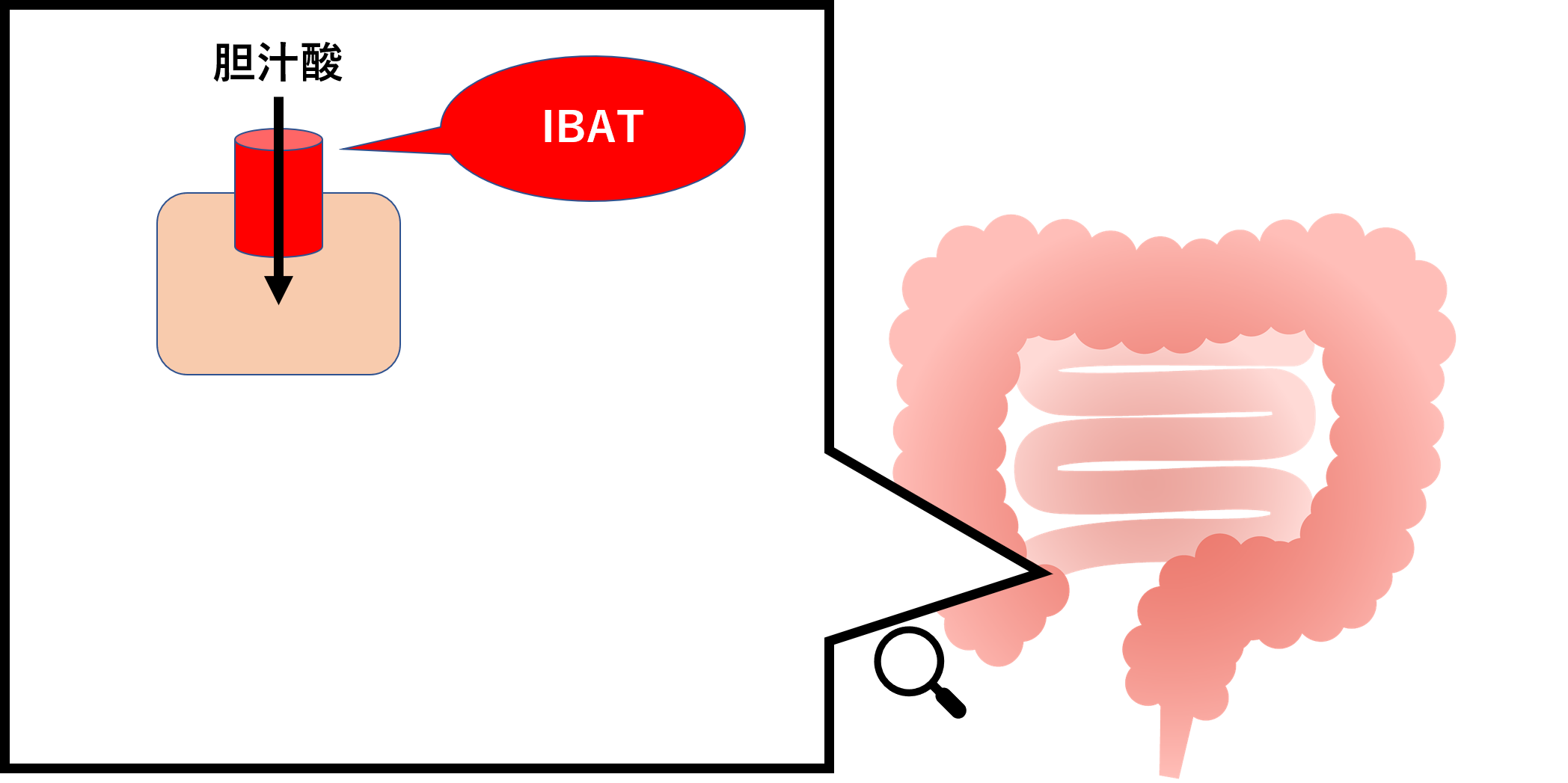 回腸の末端には、胆汁酸トランスポーター(IBAT;ileal bile acid transporter)というものが存在します。この胆汁酸トランスポーターは、胆汁酸の再吸収に関わります。