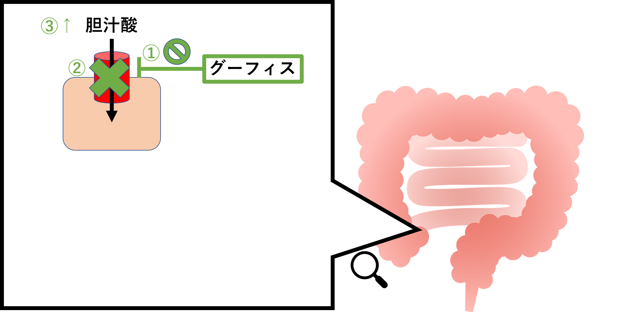 グーフィス(エロビキシバット)は、胆汁酸トランスポーターを阻害することで大腸に流入する胆汁酸を増やします。