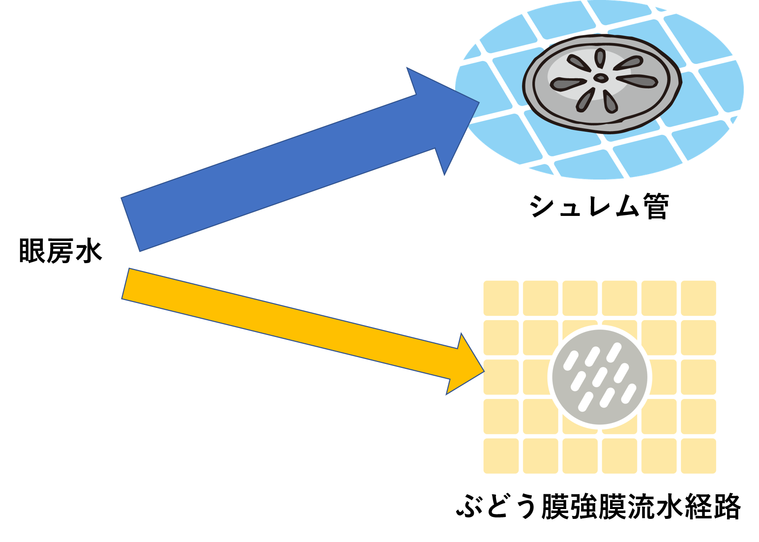 先ほど大部分はシュレム管から、眼房水が流れるという話をしましたが、残りはぶどう膜強膜流水経路という排水溝を通り排出されます。