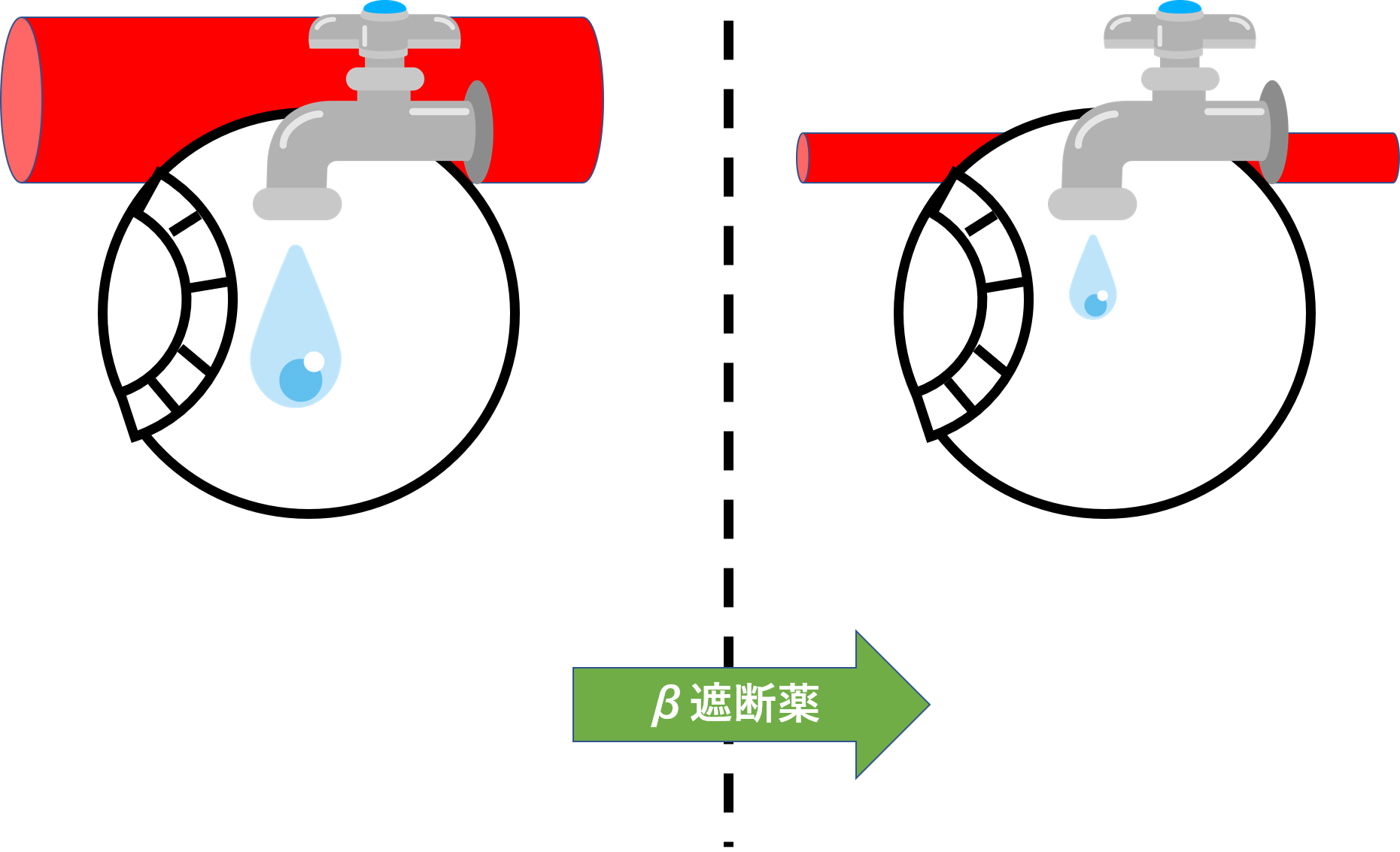 毛様体の輸入動脈にあるβ2受容体を遮断することで血管を収縮します。血管が収縮すると、無駄な水は入ってこなくなり、眼房水の産生を抑えられます。
