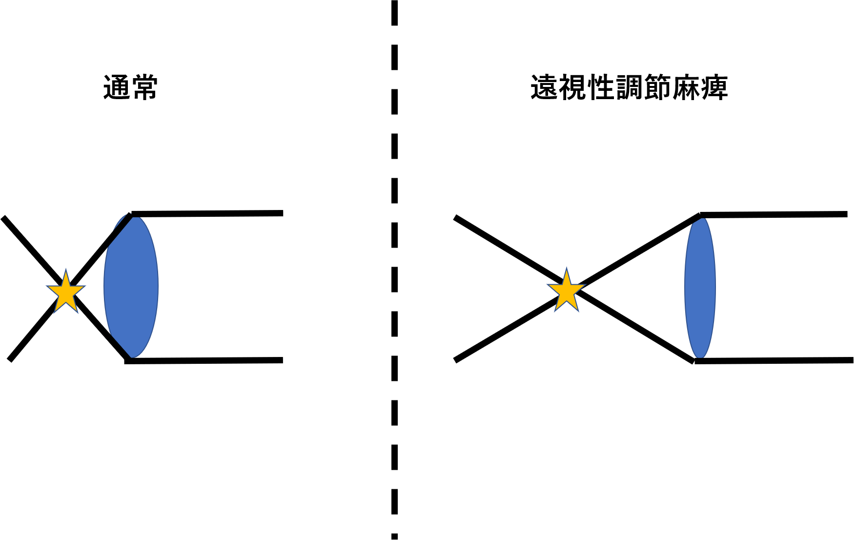 瞳孔括約筋以外にも、毛様体筋のM3受容体も遮断します。毛様体筋のM3受容体が遮断されると、毛様体筋も弛緩します。毛様体筋の弛緩が起こると、水晶体が薄くなり、遠いところに焦点が合う遠視性調節麻痺が起こります。
