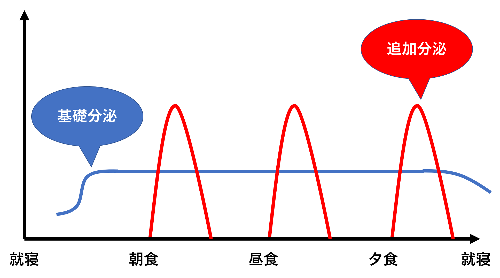 インスリンの分泌には大きく2つの種類があって、それぞれ基礎分泌、追加分泌と呼びます。