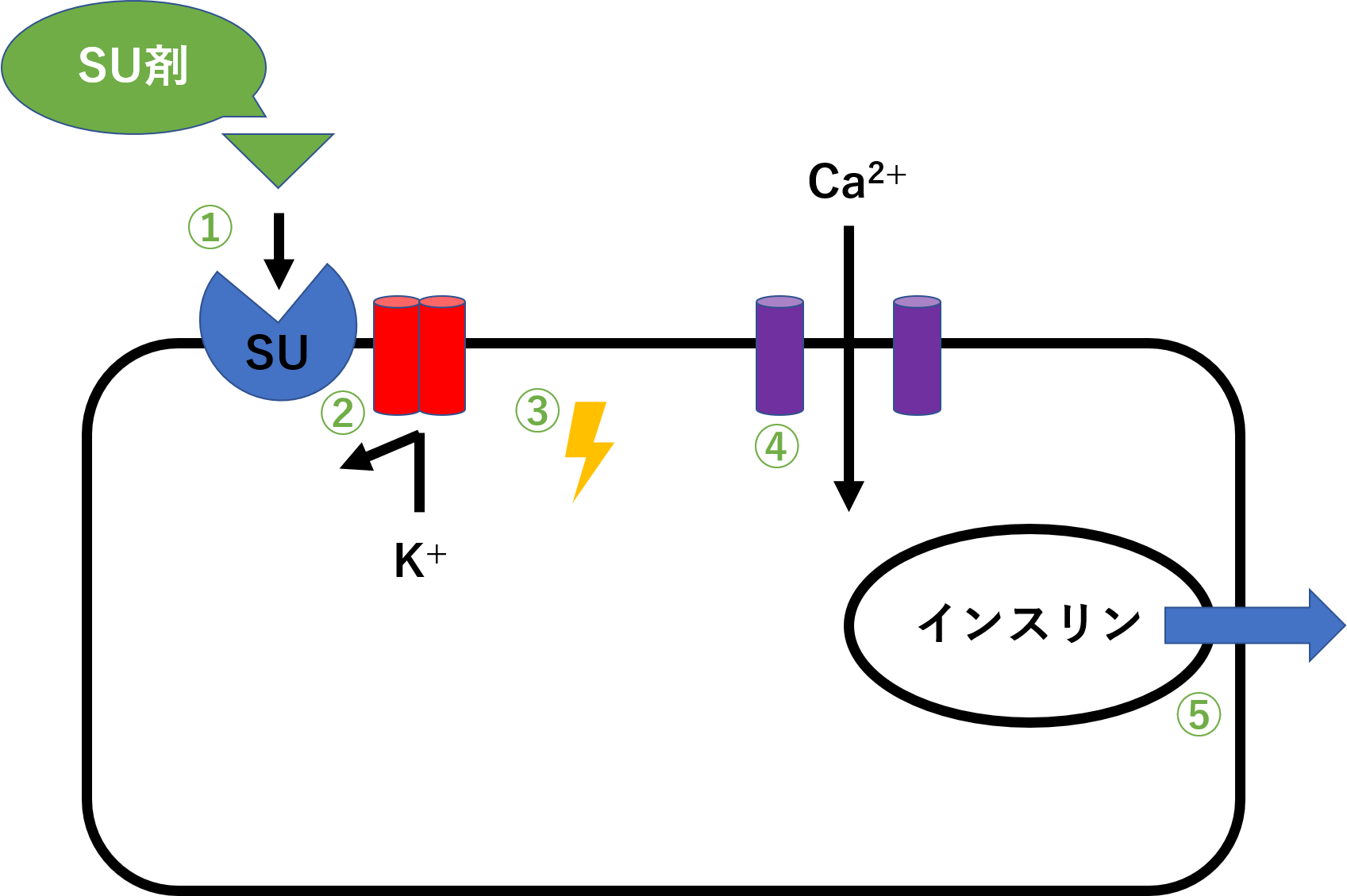 β細胞にあるSU受容体に結合します。SU受容体にくっつくと、K+チャネルを閉じ、脱分極が起こります。脱分極が起こるとCa2+チャネルを開き、細胞内のCa2+濃度が高まります。Ca2+の濃度が高まると、インスリンの分泌を促します。