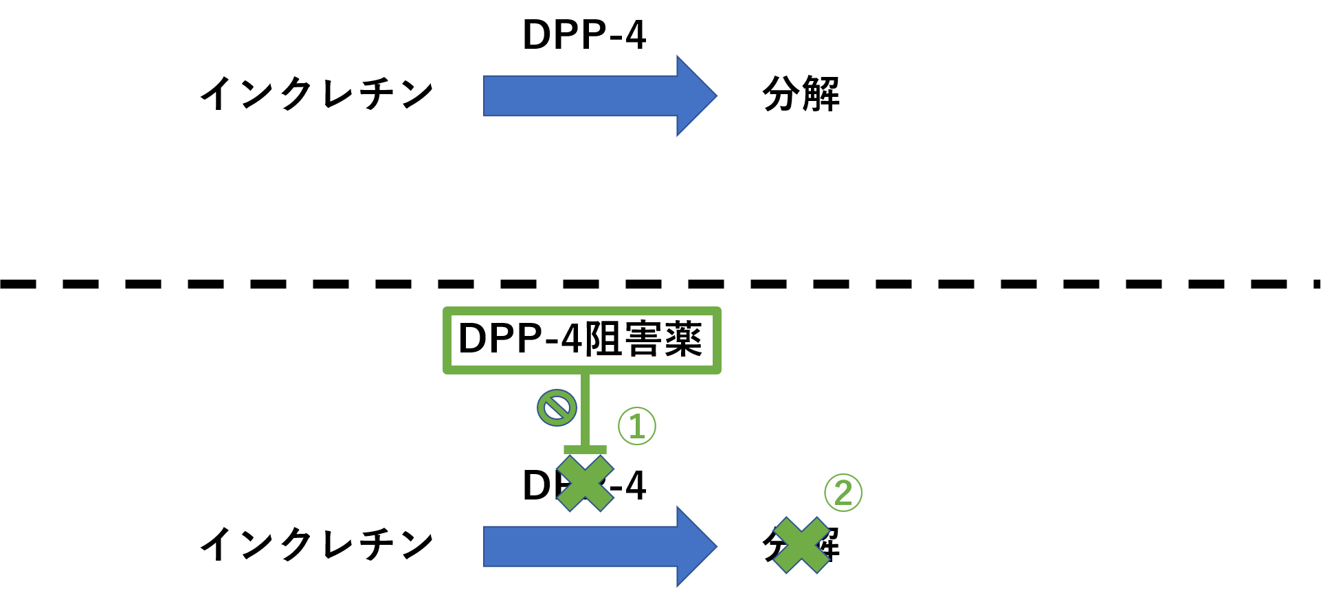 良いことばかりのインクレチンですが、これはあるものによって分解されてしまいます。それがDPP-4です。DPP-4阻害薬は、DPP-4を阻害することによってインクレチンの分解を防ぎます。よって先ほどのインクレチンの効果が得られて、血糖コントロールが得られるといったメカニズムになります。