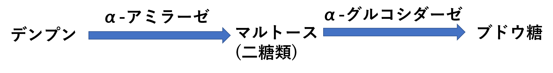 デンプンは、α-アミラーゼによってマルトース(二糖類)に分解されます。マルトース(二糖類)はさらにα-グルコシダーゼによってブドウ糖に分解され、腸管から吸収されます。