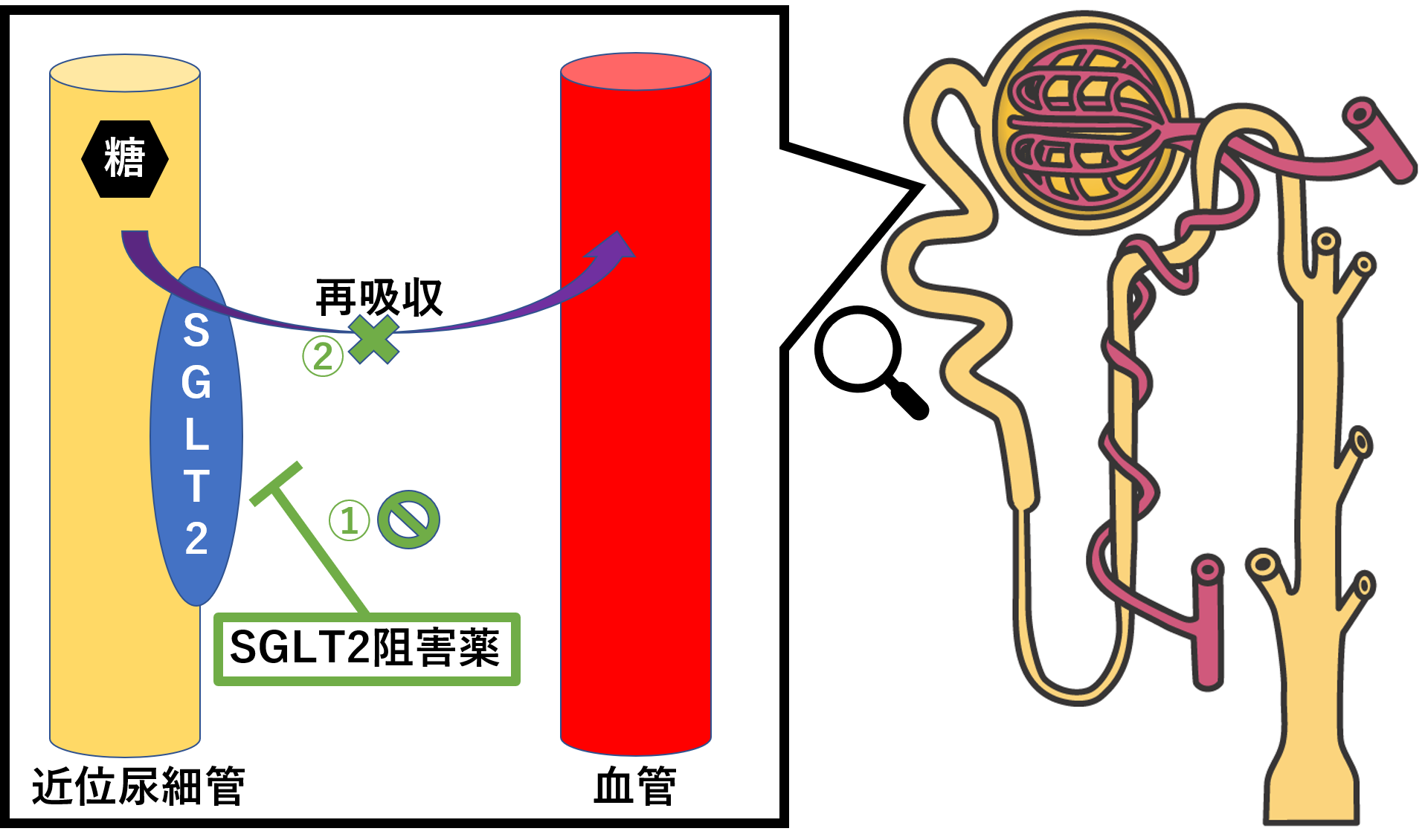 SGLT2阻害薬は、SGLT2を阻害することで、糖の再吸収を抑えて、尿中に糖を排泄させます。