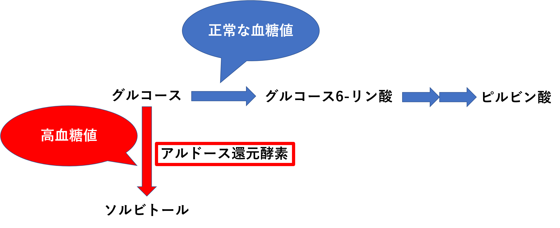 グルコースは正常であればエネルギーとして利用されます。しかし糖尿病で高血糖状態だと、グルコースはアルドース還元酵素によってソルビトールになります。このソルビトールが神経細胞内にたまり、末梢神経障害の原因となります。