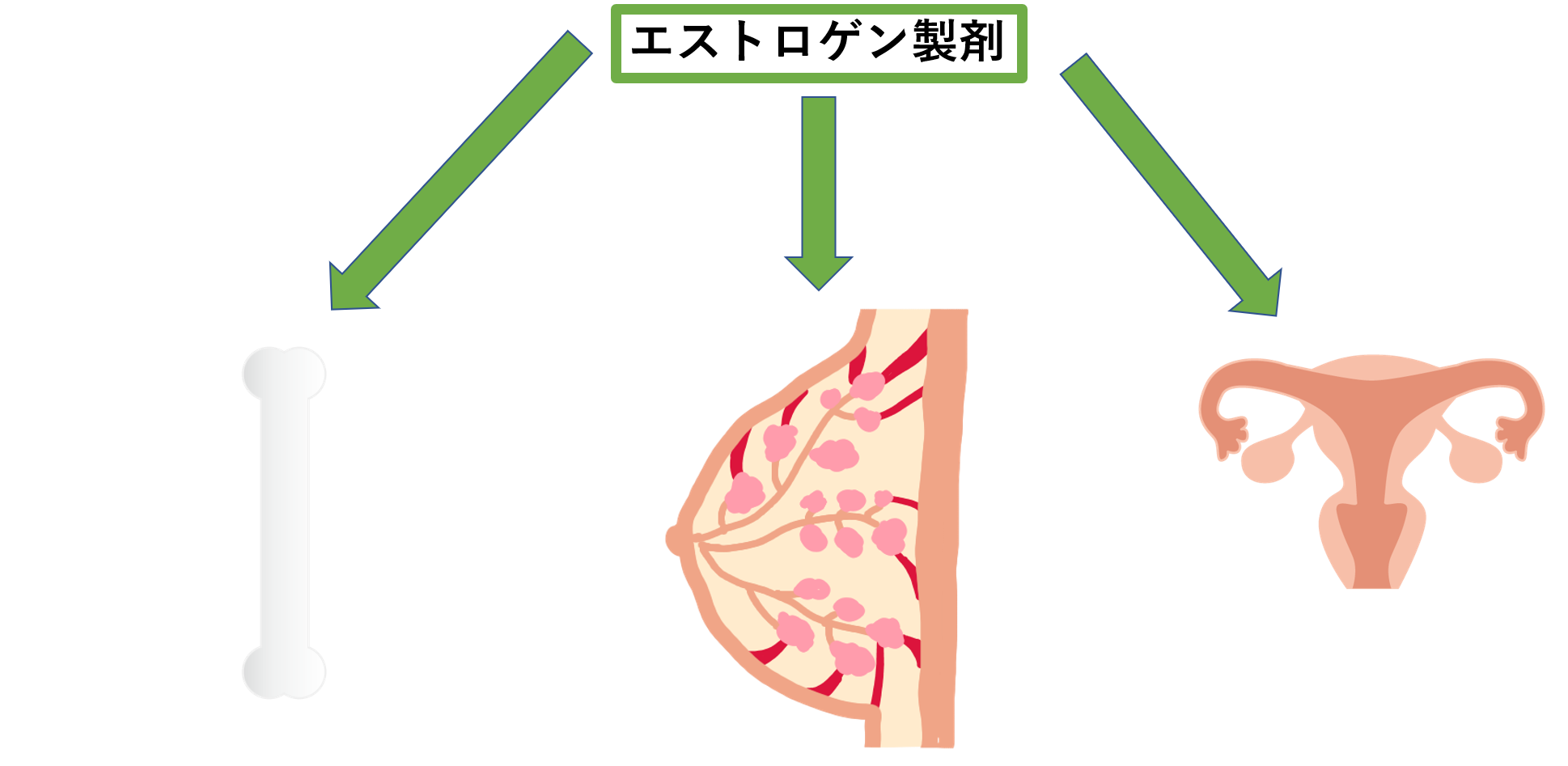先ほどのエストロゲン製剤は女性ホルモン製剤であるため、骨以外に乳房や子宮に対しても影響を与える可能性があります。そうすると、乳がんや子宮内膜がんのリスクなどが上がってしまいます。