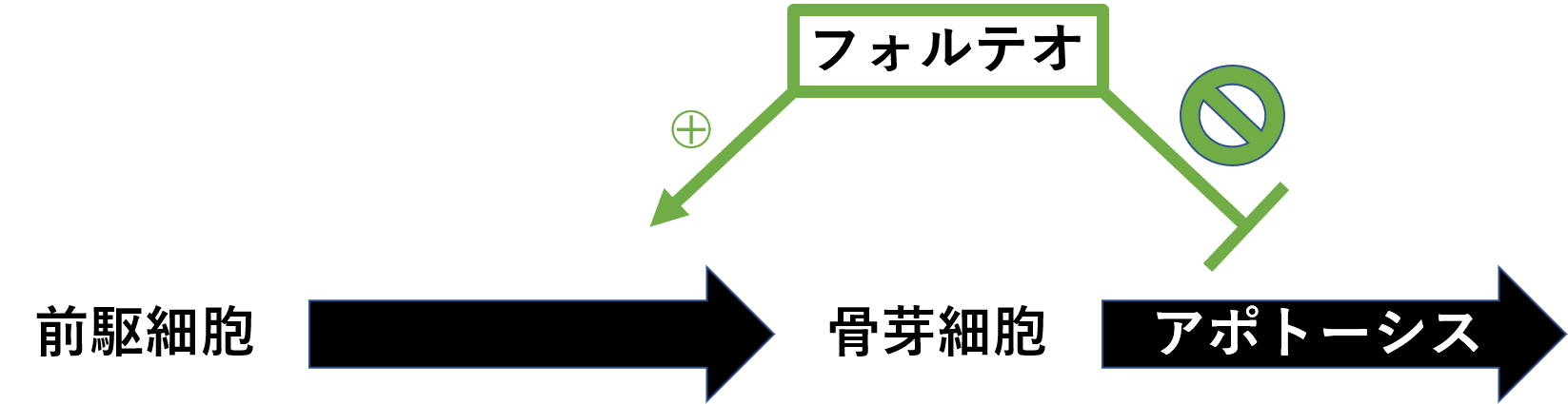 フォルテオ(テリパラチド)を投与することで、前駆細胞から骨芽細胞への分化促進や、骨芽細胞のアポトーシス抑制が起こります。その結果骨形成が促進されます。