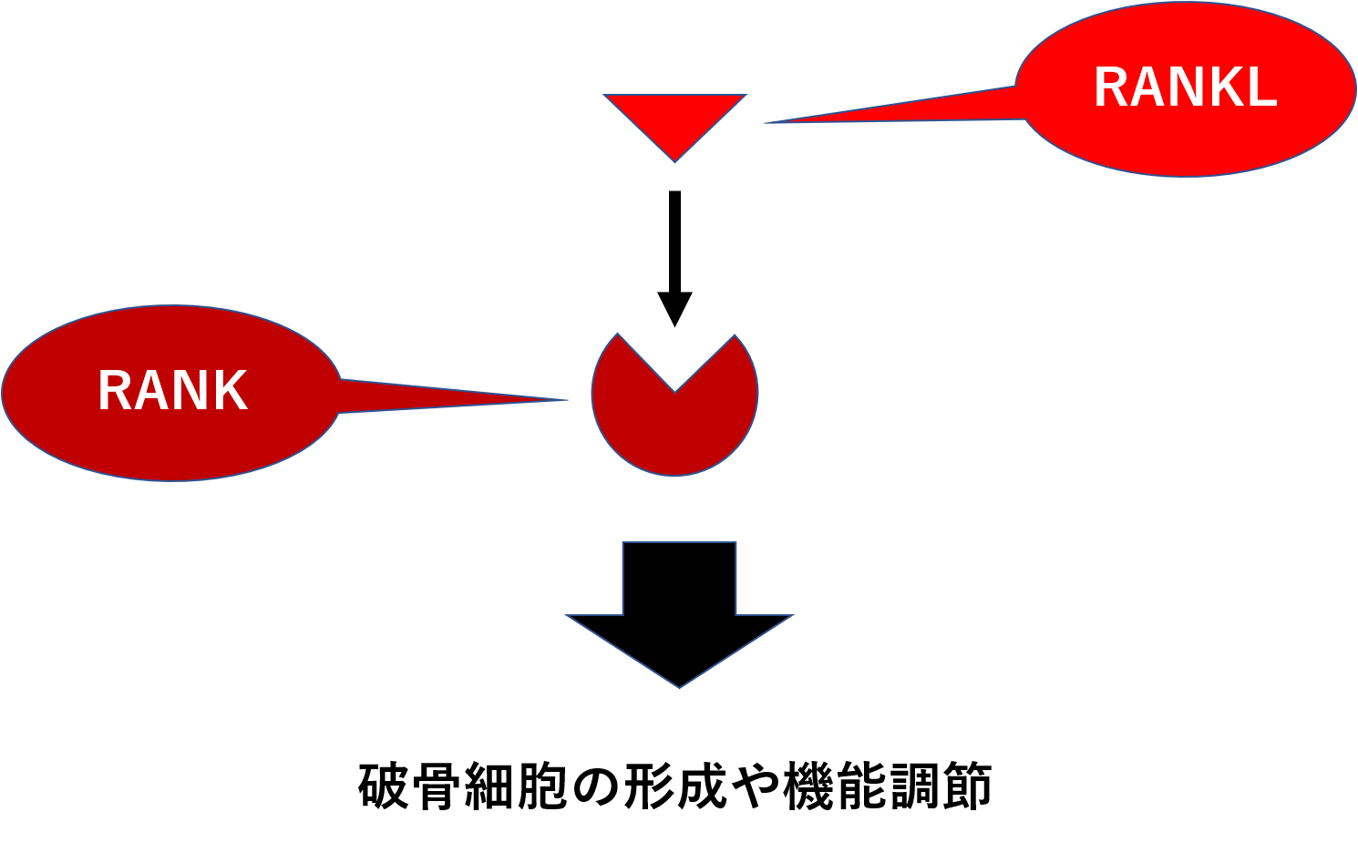 RANKはreceptor activator for nuclear factor-κB の略で、破骨細胞やその前駆細胞の表面に発現する受容体です。このRANKにくっつくリガンドが、RANKL(RANK ligand)であり、破骨細胞の形成や機能を調節します。