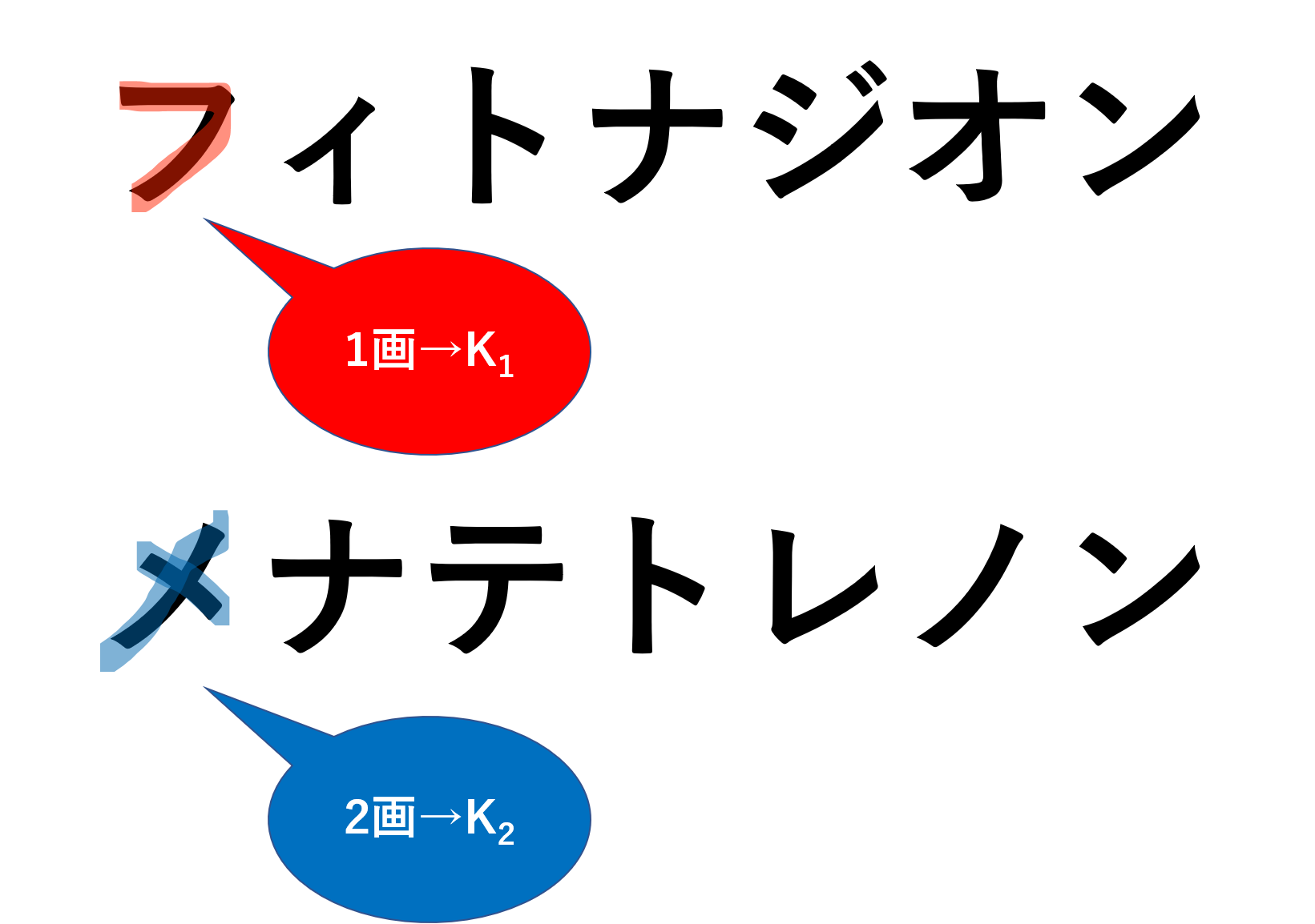 ちなみにカチーフN(フィトナジオン)がビタミンK1、ケイツー(メナテトレノン)はビタミンK2です。「ケイツー」という商品名は「ビタミンK2」と結び付けられて覚えやすいですが、成分名はなかなか覚えにくいです。そのため、私は国家試験の時は画数で覚えました。フィトナジオンの「フ」は1画で書けるためビタミンK1、メナテトレノンの「メ」は2画で書けるためビタミンK2といった感じです。