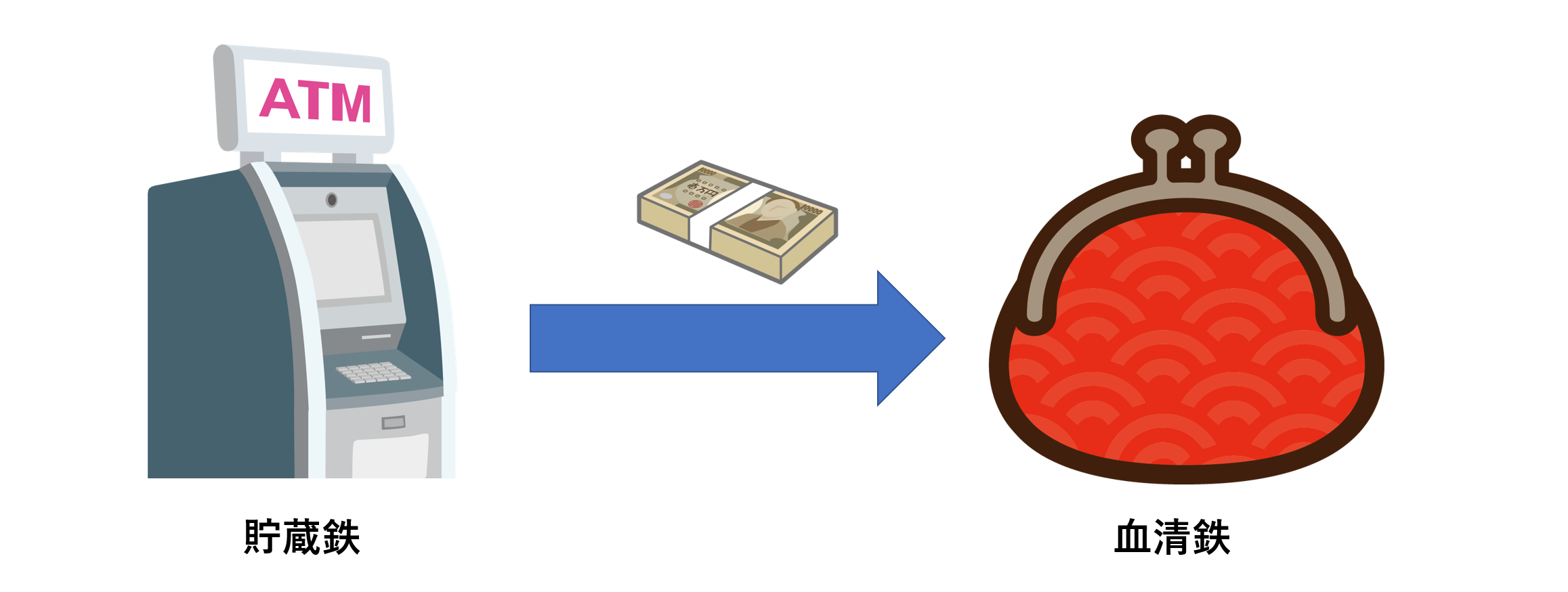 鉄欠乏性貧血は、貯蔵鉄、血清鉄の順番で減っていきます。お金で例えるならば、貯金を切り崩して、お財布のお金を保っている状態です。