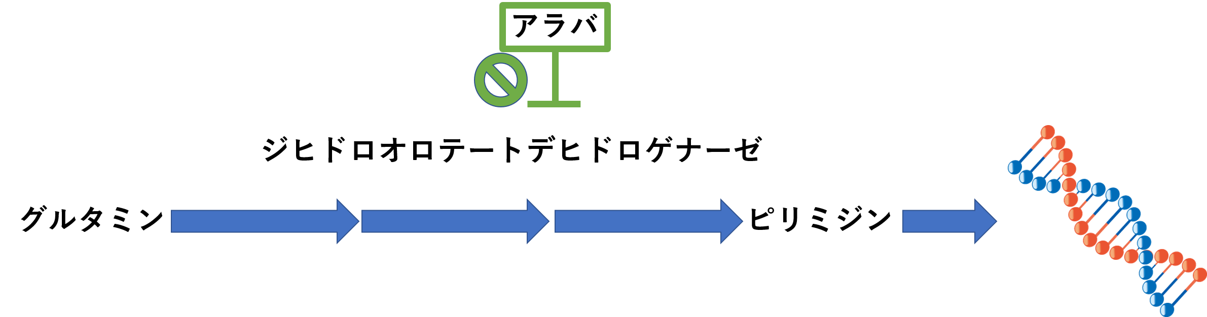 アラバ(レフルノミド)はジヒドロオロテートデヒドロゲナーゼを阻害して、ピリミジンを作れなくします。